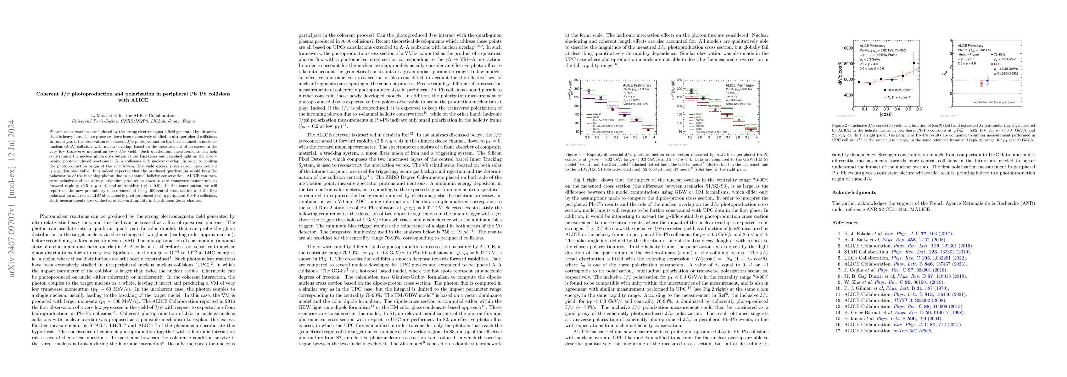 Photonuclear reactions are induced by the strong electromagnetic field generated by ultrarelativistic heavy ions. These processes have been extensively studied in ultraperipheral collisions. In recent years, the observation of coherent J/$\psi$ photoproduction has been claimed in nucleus-nucleus (A-A) collisions with nuclear overlap, based on the measurement of an excess in the very low transverse momentum ($p_{\rm T}$) J/$\psi$ yield. Such quarkonium measurements can help constraining the nuclear gluon distribution at low Bjorken-$x$ and can shed light on the theory behind photon induced reactions in A-A collisions with nuclear overlap. In order to confirm the photoproduction origin of the very low-$p_{\rm T}$ J/$\psi$ yield excess, polarization measurement is a golden observable. It is indeed expected that the produced quarkonium would keep the polarization of the incoming photon due to $s$-channel helicity conservation. ALICE can measure inclusive and exclusive quarkonium production down to zero transverse momentum, at forward rapidity (2.5 $< y <$ 4) and midrapidity ($|y| <$ 0.9). In this contribution, we will report on the new preliminary measurement of the $y$-differential cross section and the first polarization analysis at LHC of coherently photoproduced J/$\psi$ in peripheral Pb-Pb collisions. Both measurements are conducted at forward rapidity in the dimuon decay channel.