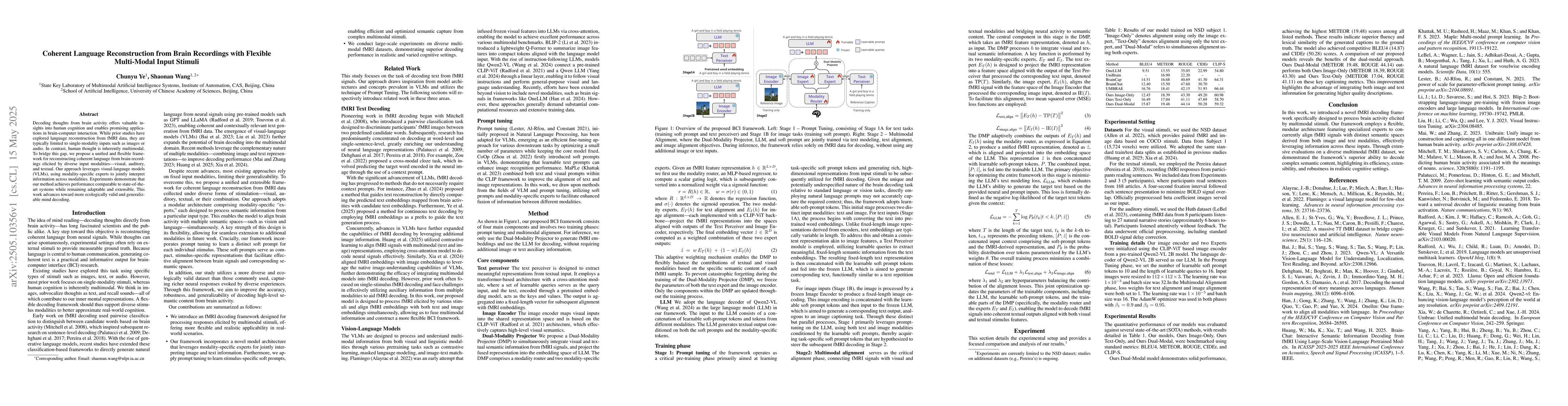 The research proposes a unified framework for reconstructing coherent language from brain recordings using visual-language models (VLMs) and modality-specific experts to interpret multimodal inputs (visual, auditory, and textual).