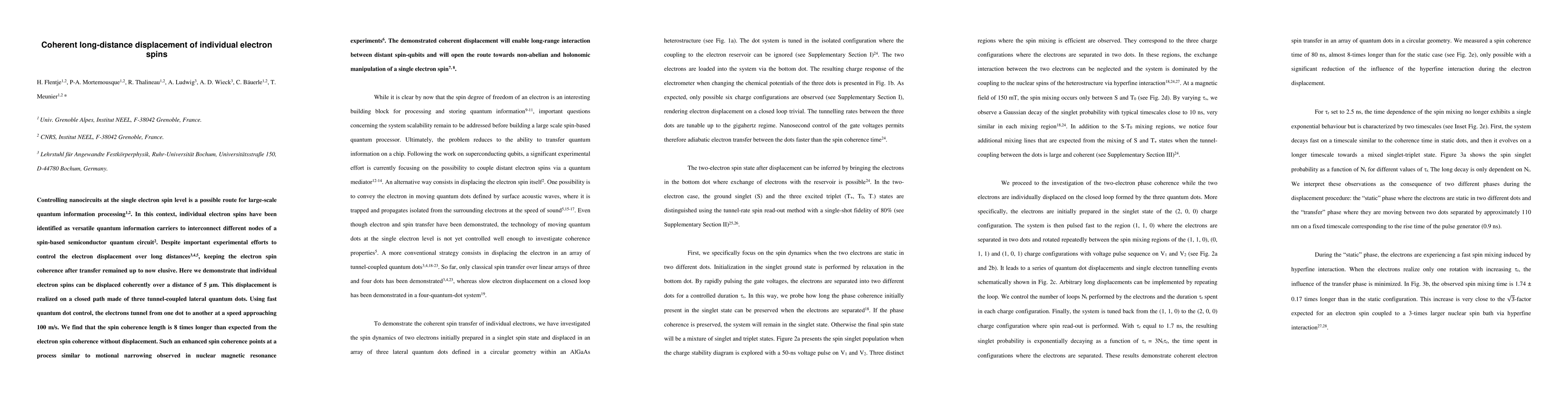 This paper demonstrates the coherent displacement of individual electron spins over 5 micrometers in a three-tunnel-coupled quantum dot system, achieving an 8-fold enhancement in spin coherence. This breakthrough enables long-range interaction between spin-qubits and paves the way for advanced quantum information processing.