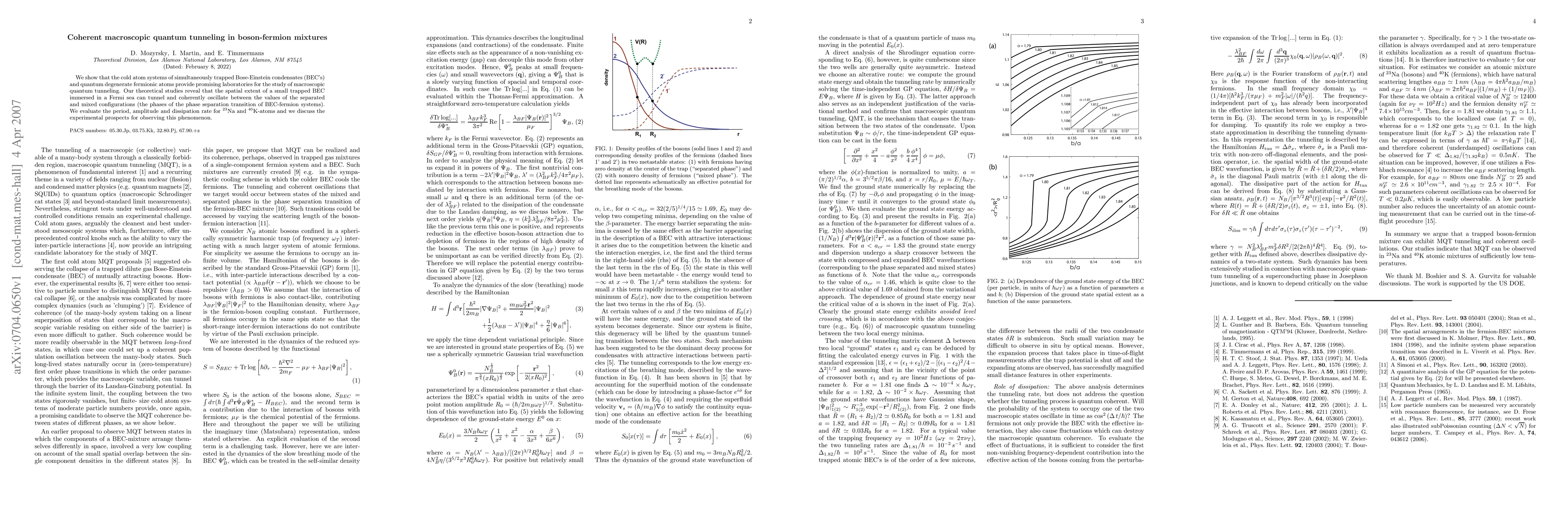 This paper demonstrates that cold atom systems combining Bose-Einstein condensates and fermionic atoms can exhibit coherent macroscopic quantum tunneling. Theoretical studies predict oscillations between separated and mixed configurations, with evaluations for specific atomic species and discussions on experimental observation prospects.