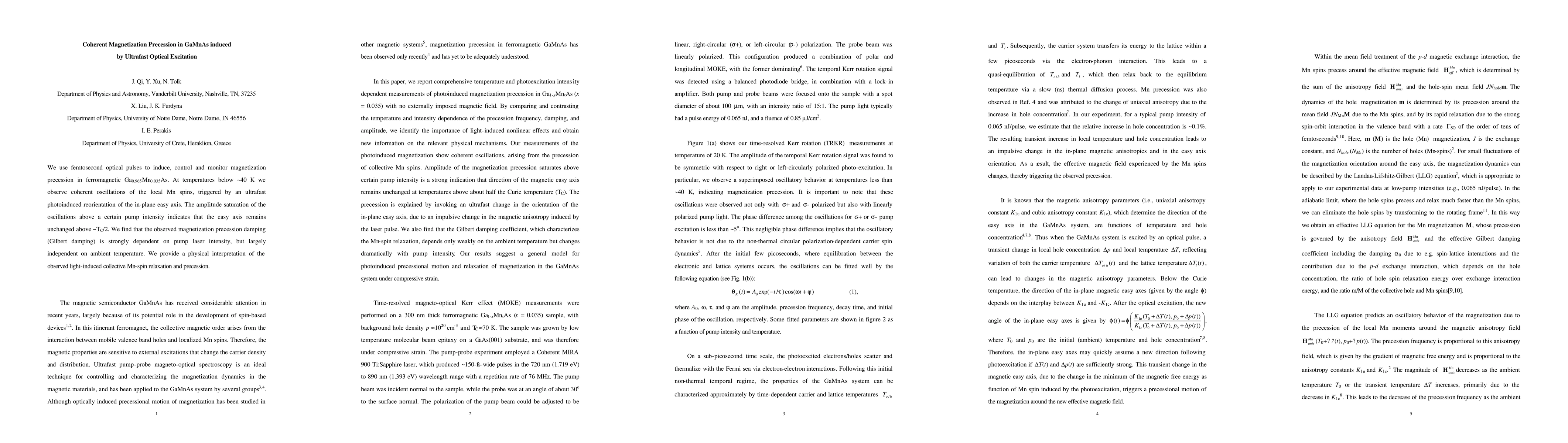 This paper investigates the coherent magnetization precession in GaMnAs using ultrafast optical pulses, revealing coherent oscillations of Mn spins triggered by photoinduced reorientation of the in-plane easy axis. The study finds that the precession damping is intensity-dependent but largely temperature-independent, providing insights into the physical mechanisms behind light-induced spin relaxation and precession.