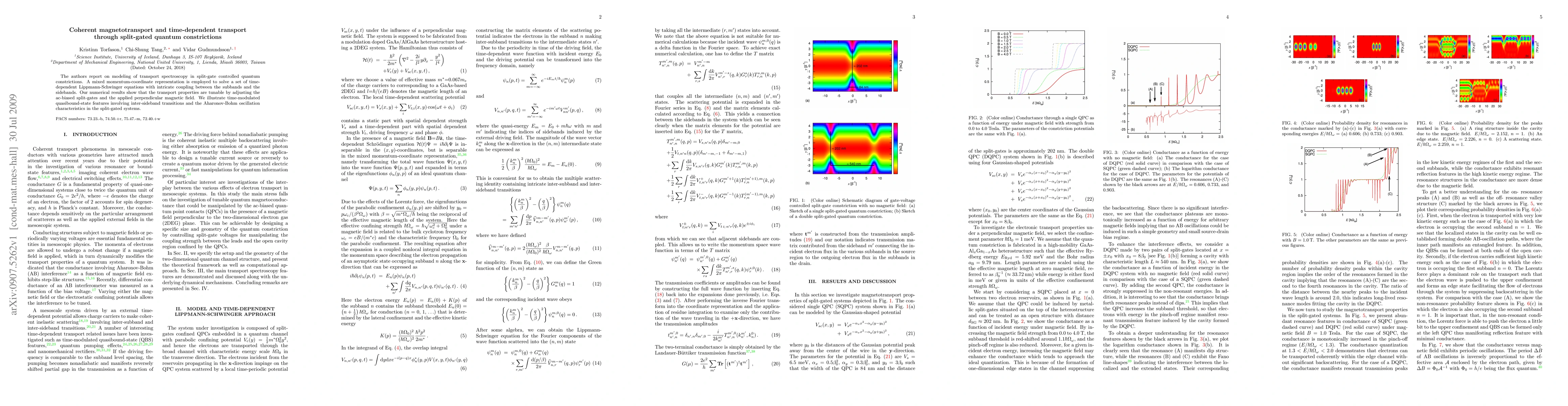 The authors report on modeling of transport spectroscopy in split-gate controlled quantum constrictions. A mixed momentum-coordinate representation is employed to solve a set of time-dependent Lippmann-Schwinger equations with intricate coupling between the subbands and the sidebands. Our numerical results show that the transport properties are tunable by adjusting the ac-biased split-gates and the applied perpendicular magnetic field. We illustrate time-modulated quasibound-state features involving inter-sideband transitions and the Aharonov-Bohm oscillation characteristics in the split-gated systems.
