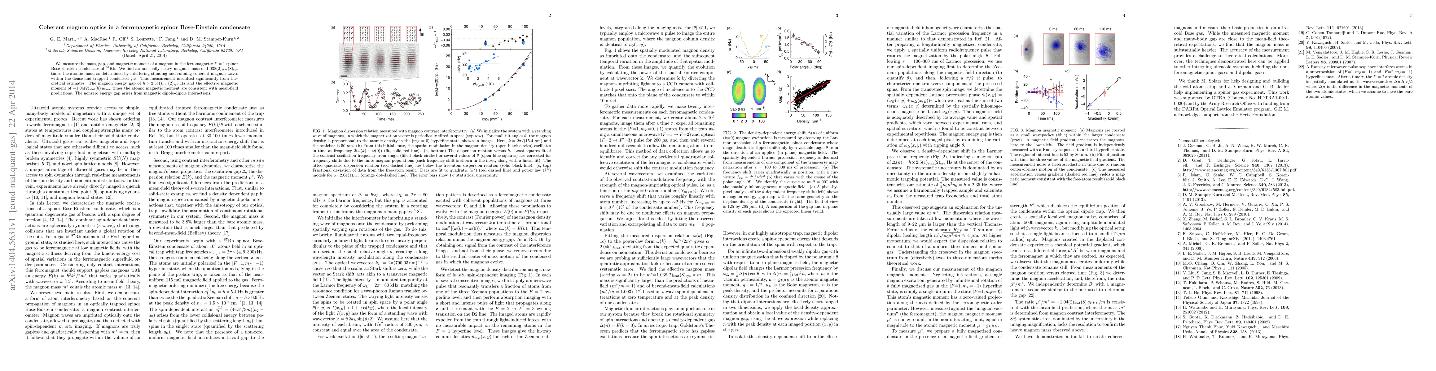 We measure the mass, gap, and magnetic moment of a magnon in the ferromagnetic $F=1$ spinor Bose-Einstein condensate of $^{87}$Rb. We find an unusually heavy magnon mass of $1.038(2)_\mathrm{stat}(8)_\mathrm{sys}$ times the atomic mass, as determined by interfering standing and running coherent magnon waves within the dense and trapped condensed gas. This measurement is shifted significantly from theoretical estimates. The magnon energy gap of $h\times 2.5(1)_\mathrm{stat}(2)_\mathrm{sys}\;\mathrm{Hz}$ and the effective magnetic moment of $-1.04(2)_\mathrm{stat}(8)\,\mu_\textrm{bare}$ times the atomic magnetic moment are consistent with mean-field predictions. The nonzero energy gap arises from magnetic dipole-dipole interactions.
