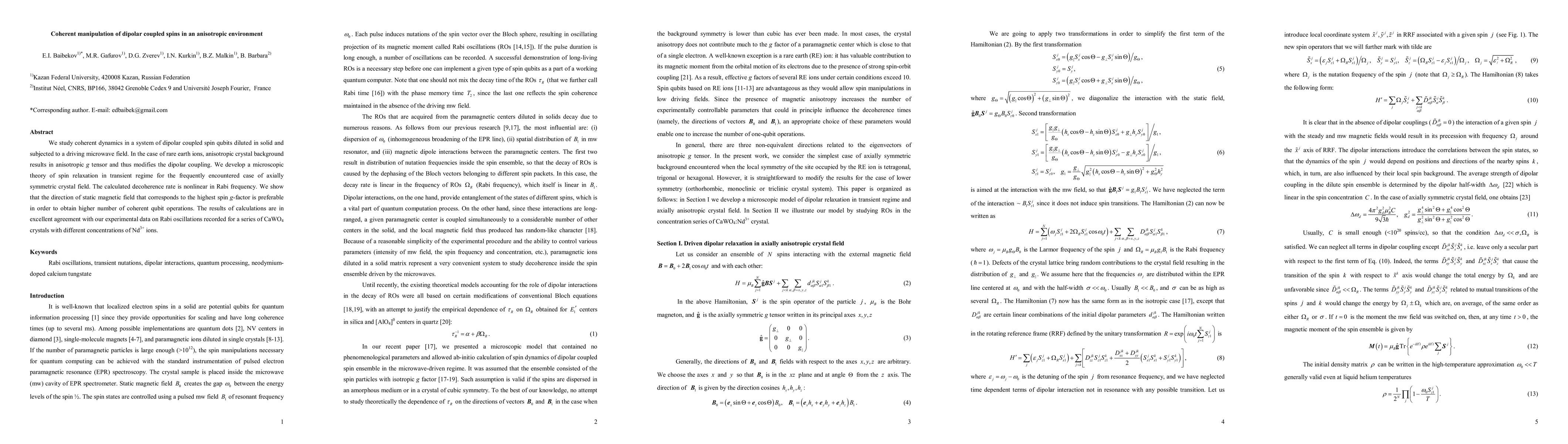 We study coherent dynamics in a system of dipolar coupled spin qubits diluted in solid and subjected to a driving microwave field. In the case of rare earth ions, anisotropic crystal background results in anisotropic g tensor and thus modifies the dipolar coupling. We develop a microscopic theory of spin relaxation in transient regime for the frequently encountered case of axially symmetric crystal field. The calculated decoherence rate is nonlinear in Rabi frequency. We show that the direction of static magnetic field that corresponds to the highest spin g-factor is preferable in order to obtain higher number of coherent qubit operations. The results of calculations are in excellent agreement with our experimental data on Rabi oscillations recorded for a series of CaWO4 crystals with different concentrations of Nd3+ ions.