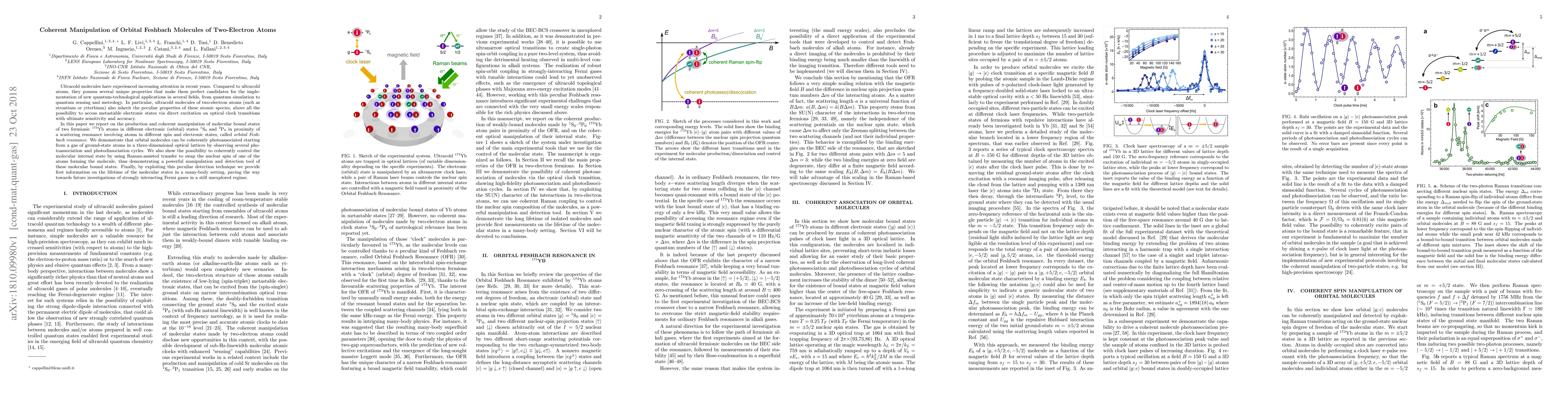 Ultracold molecules have experienced increasing attention in recent years. Compared to ultracold atoms, they possess several unique properties that make them perfect candidates for the implementation of new quantum-technological applications in several fields, from quantum simulation to quantum sensing and metrology. In particular, ultracold molecules of two-electron atoms (such as strontium or ytterbium) also inherit the peculiar properties of these atomic species, above all the possibility to access metastable electronic states via direct excitation on optical clock transitions with ultimate sensitivity and accuracy. In this paper we report on the production and coherent manipulation of molecular bound states of two fermionic $^{173}$Yb atoms in different electronic (orbital) states $^1$S$_0$ and $^3$P$_0$ in proximity of a scattering resonance involving atoms in different spin and electronic states, called orbital Feshbach resonance. We demonstrate that orbital molecules can be coherently photoassociated starting from a gas of ground-state atoms in a three-dimensional optical lattices by observing several photoassociation and photodissociation cycles. We also show the possibility to coherently control the molecular internal state by using Raman-assisted transfer to swap the nuclear spin of one of the atoms forming the molecule, thus demonstrating a powerful manipulation and detection tool of these molecular bound states. Finally, by exploiting this peculiar detection technique we provide first information on the lifetime of the molecular states in a many-body setting, paving the way towards future investigations of strongly interacting Fermi gases in a still unexplored regime.
