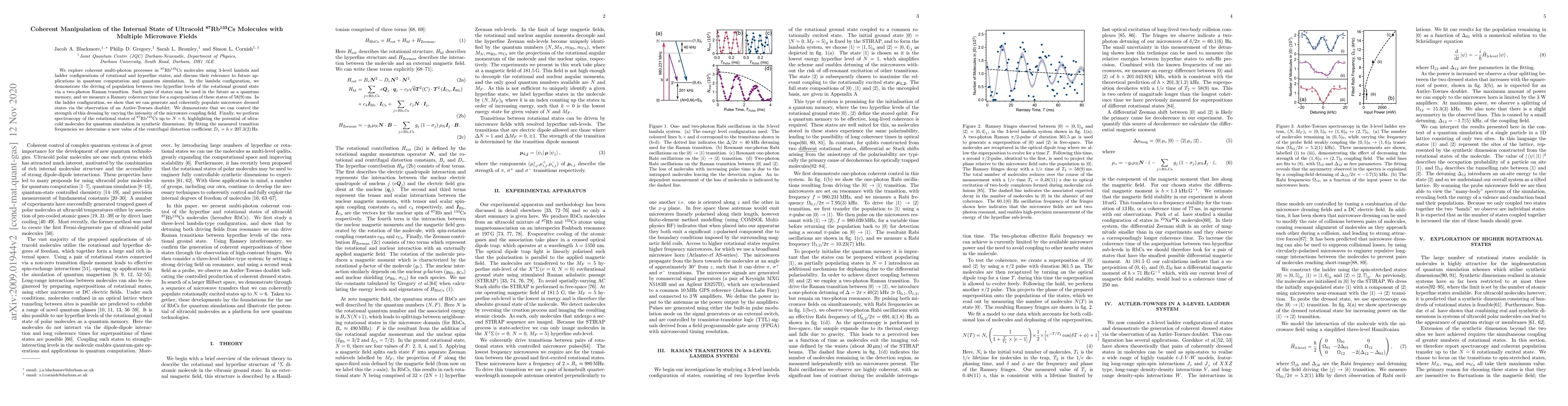 This paper investigates coherent manipulation of ultracold $^{87}$Rb$^{133}$Cs molecules using microwave fields, demonstrating multi-photon processes in lambda and ladder configurations for potential quantum computation and simulation applications. It measures a Ramsey coherence time of 58(9) ms and reports a new value for the centrifugal distortion coefficient.