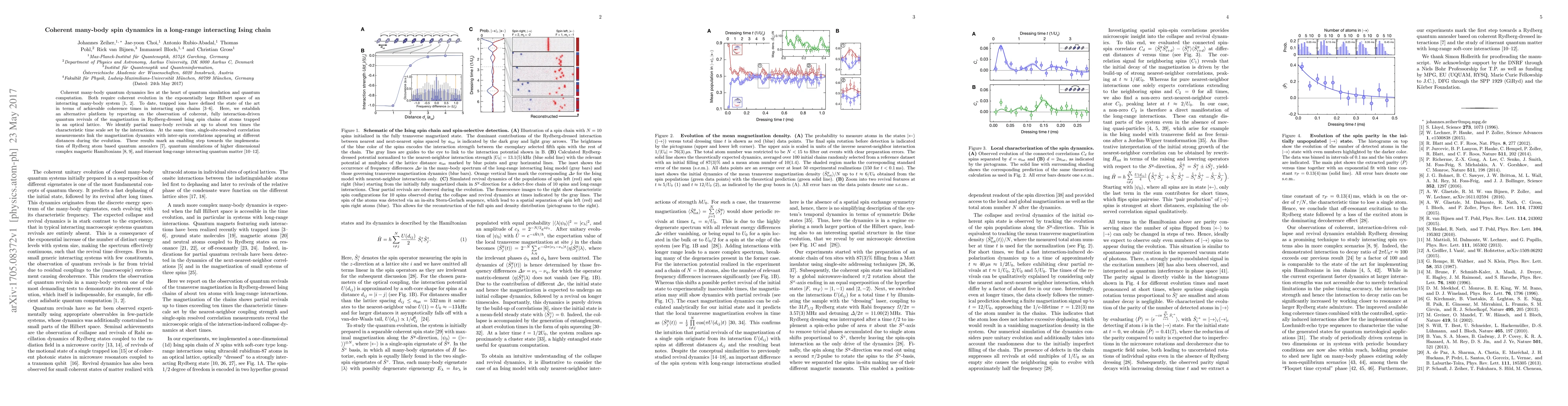 This paper reports on the observation of coherent many-body quantum revivals in Rydberg-dressed Ising spin chains of atoms in an optical lattice, demonstrating a new platform for quantum simulation and computation. The study reveals partial many-body revivals and links magnetization dynamics to inter-spin correlations, paving the way for advanced quantum annealers and simulations.