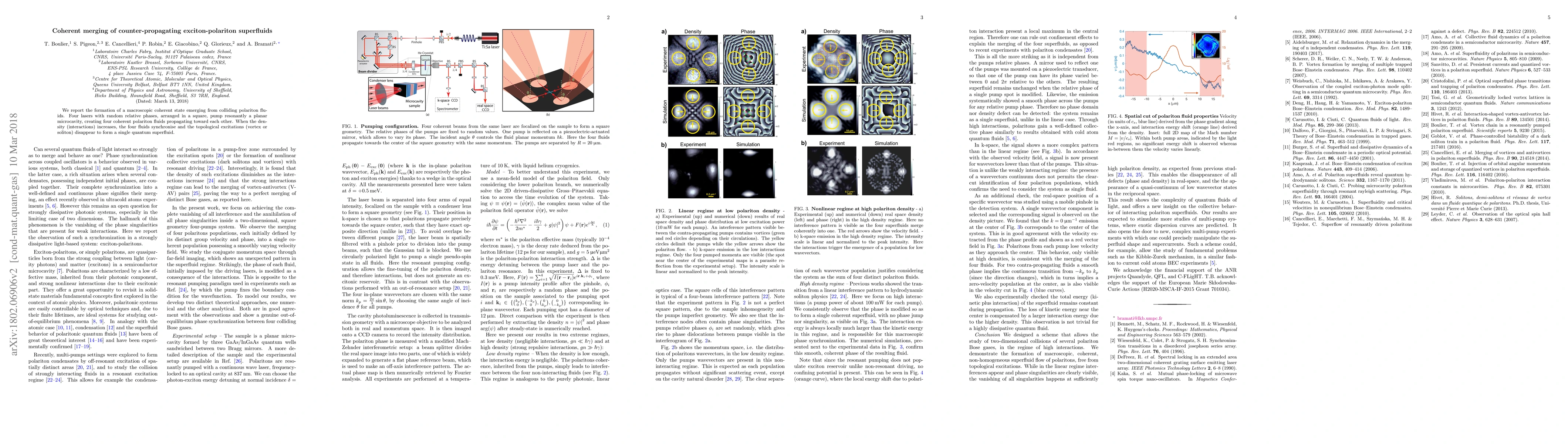This research demonstrates the formation of a coherent macroscopic superfluid state from the merging of four counter-propagating exciton-polariton fluids. As the density increases, the fluids synchronize, eliminating topological excitations and resulting in a single superfluid.