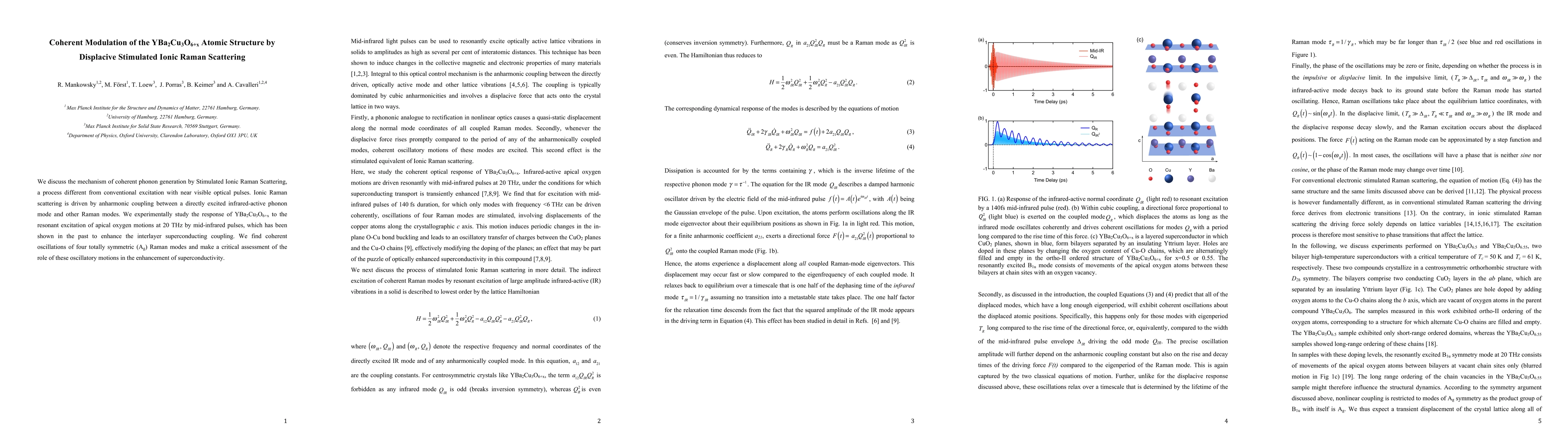 We discuss the mechanism of coherent phonon generation by Stimulated Ionic Raman Scattering, a process different from conventional excitation with near visible optical pulses. Ionic Raman scattering is driven by anharmonic coupling between a directly excited infrared-active phonon mode and other Raman modes. We experimentally study the response of YBa2Cu3O6+x to the resonant excitation of apical oxygen motions at 20 THz by mid-infrared pulses, which has been shown in the past to enhance the interlayer superconducting coupling. We find coherent oscillations of four totally symmetric (Ag) Raman modes and make a critical assessment of the role of these oscillatory motions in the enhancement of superconductivity.