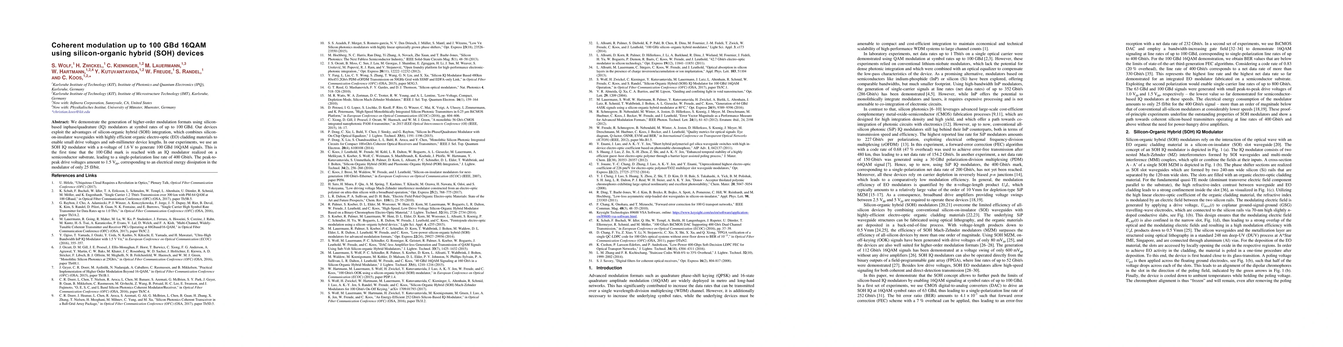 This research demonstrates the use of silicon-organic hybrid devices to generate 100 GBd 16QAM signals, achieving a single-polarization line rate of 400 Gbit/s with low drive voltages and energy dissipation, marking the first time this modulation rate is reached on a semiconductor substrate.