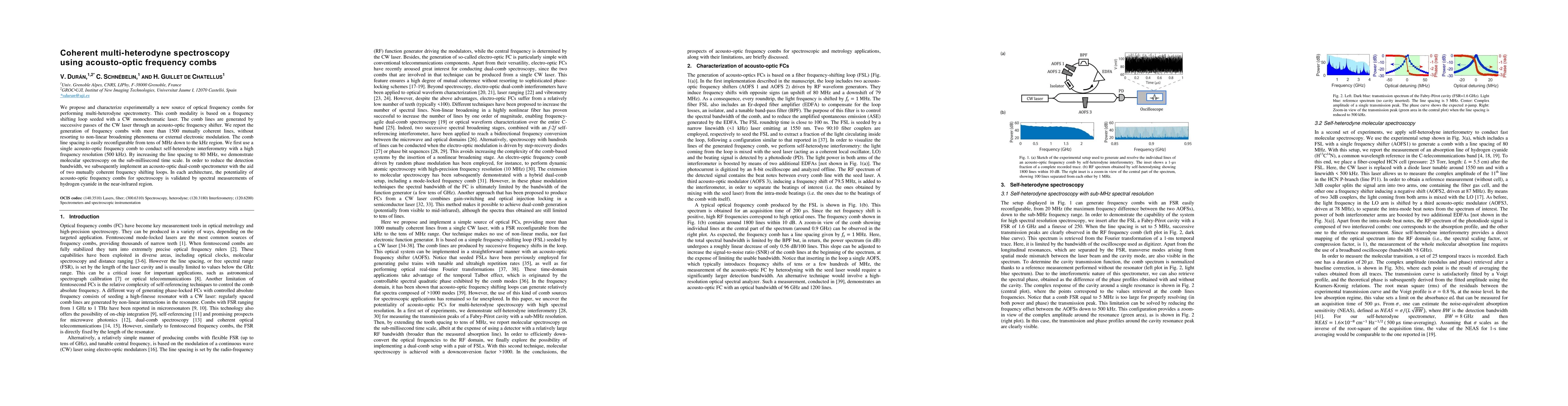 This paper proposes a novel optical frequency comb generated using acousto-optic shifters for multi-heterodyne spectrometry, demonstrating molecular spectroscopy on sub-millisecond timescales and validating its potential for high-resolution spectral measurements. The technique offers reconfigurable comb line spacing and utilizes coherent acousto-optic frequency shifting without non-linear broadening.