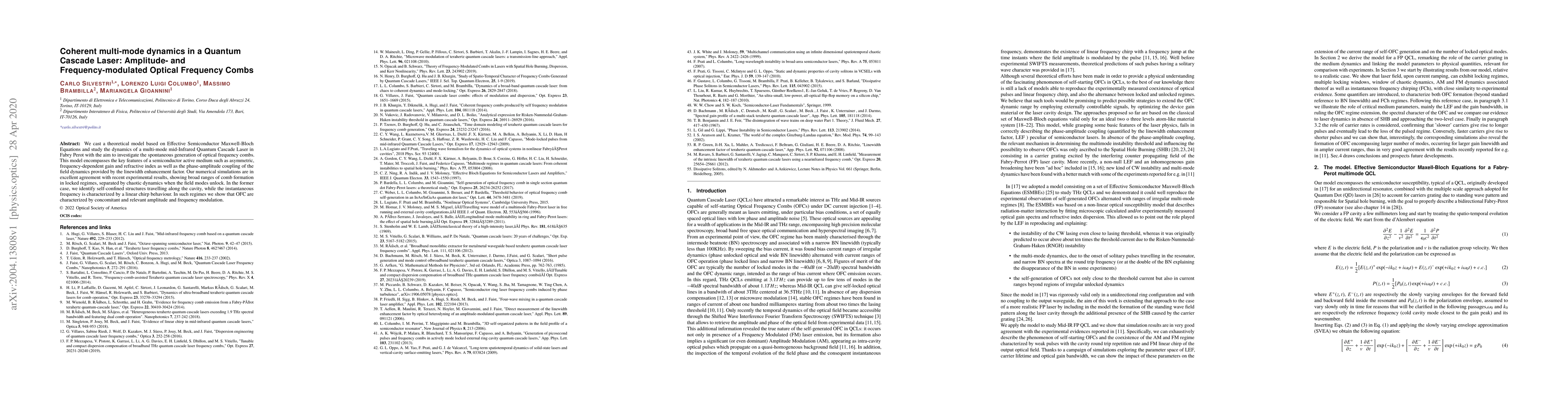 We cast a theoretical model based on Effective Semiconductor Maxwell-Bloch Equations and study the dynamics of a multi-mode mid-Infrared Quantum Cascade Laser in Fabry Perot with the aim to investigate the spontaneous generation of optical frequency combs. This model encompasses the key features of a semiconductor active medium such as asymmetric,frequency-dependent gain and refractive index as well as the phase-amplitude coupling of the field dynamics provided by the linewidth enhancement factor. Our numerical simulations are in excellent agreement with recent experimental results, showing broad ranges of comb formationin locked regimes, separated by chaotic dynamics when the field modes unlock. In the former case, we identify self-confined structures travelling along the cavity, while the instantaneous frequency is characterized by a linear chirp behaviour. In such regimes we show that OFC are characterized by concomitant and relevant amplitude and frequency modulation.