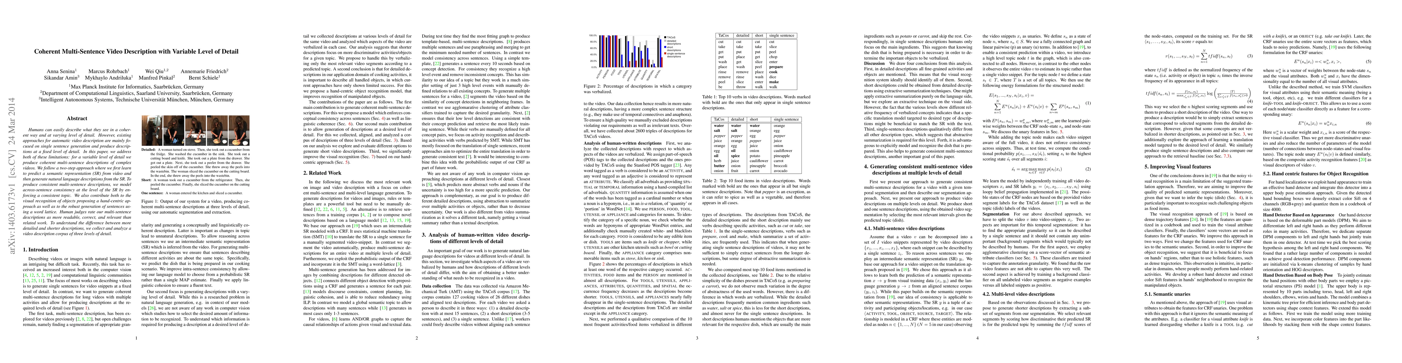 Humans can easily describe what they see in a coherent way and at varying level of detail. However, existing approaches for automatic video description are mainly focused on single sentence generation and produce descriptions at a fixed level of detail. In this paper, we address both of these limitations: for a variable level of detail we produce coherent multi-sentence descriptions of complex videos. We follow a two-step approach where we first learn to predict a semantic representation (SR) from video and then generate natural language descriptions from the SR. To produce consistent multi-sentence descriptions, we model across-sentence consistency at the level of the SR by enforcing a consistent topic. We also contribute both to the visual recognition of objects proposing a hand-centric approach as well as to the robust generation of sentences using a word lattice. Human judges rate our multi-sentence descriptions as more readable, correct, and relevant than related work. To understand the difference between more detailed and shorter descriptions, we collect and analyze a video description corpus of three levels of detail.