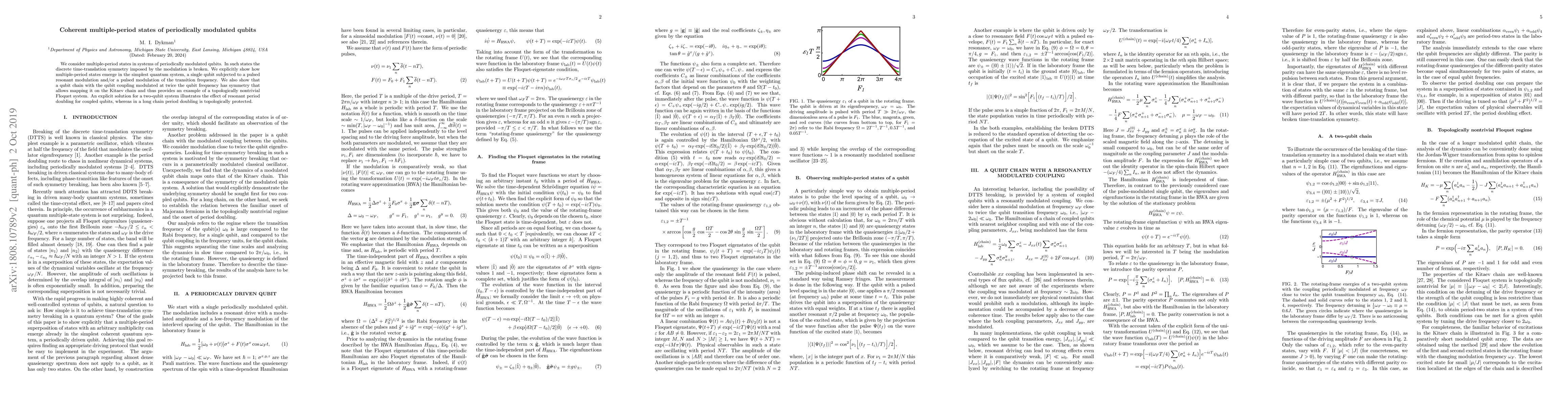We consider multiple-period states in systems of periodically modulated qubits. In such states the discrete time-translation symmetry imposed by the modulation is broken. We explicitly show how multiple-period states emerge in the simplest quantum system, a single qubit subjected to a pulsed resonant modulation and/or a pulsed modulation of the transition frequency. We also show that a qubit chain with the qubit coupling modulated at twice the qubit frequency has symmetry that allows mapping it on the Kitaev chain and thus provides an example of a topologically nontrivial Floquet system. An explicit solution for a two-qubit system illustrates the effect of resonant period doubling for coupled qubits, whereas in a long chain period doubling is topologically protected.