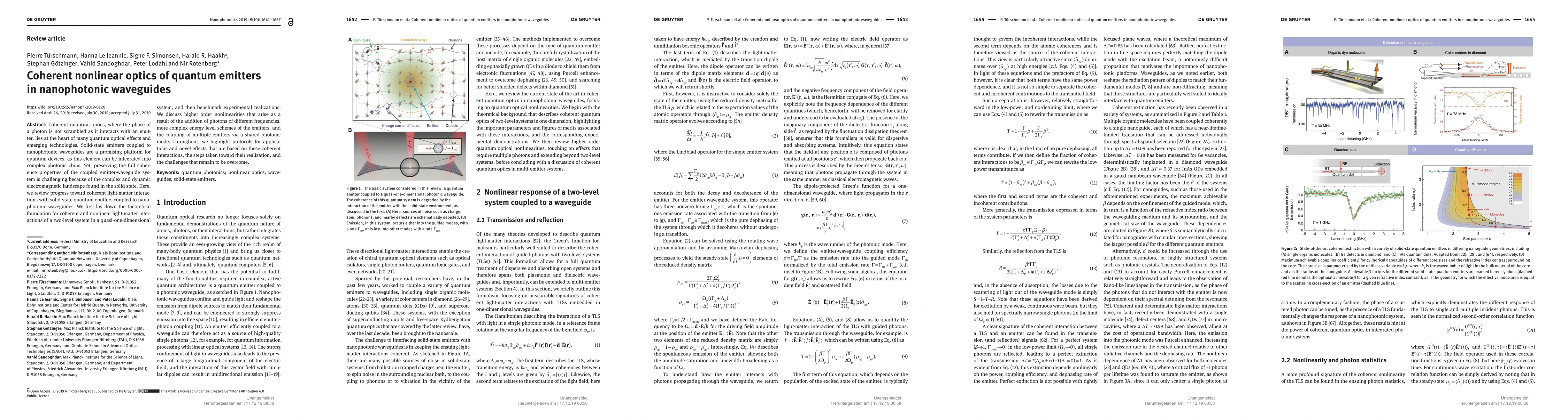 Coherent quantum optics, where the interaction of a photon with an emitter does not scramble phase coherence, lies at the heart of many quantum optical effects and emerging technologies. Solid-state emitters coupled to nanophotonic waveguides are a promising platform for quantum devices, as this combination is scalable. Yet, reaching full coherence in these systems is challenging due to the dynamics of the solid-state environment of the emitters. Here, we review progress towards coherent light-matter interactions with solid-state quantum emitters coupled to nanophotonic waveguides. We first lay down the theoretical foundation for coherent and nonlinear light-matter interactions of a two-level system in a quasi-one-dimensional system, and then benchmark experimental realizations. We then discuss higher-order nonlinearities that arise due to the addition of photons of different frequencies, more complex energy-level schemes of the emitters, and the coupling of multiple emitters via a shared photonic mode. Throughout, we highlight protocols for applications and novel effects that are based on these coherent interactions, the steps taken towards their realization, and the challenges that remain to be overcome.