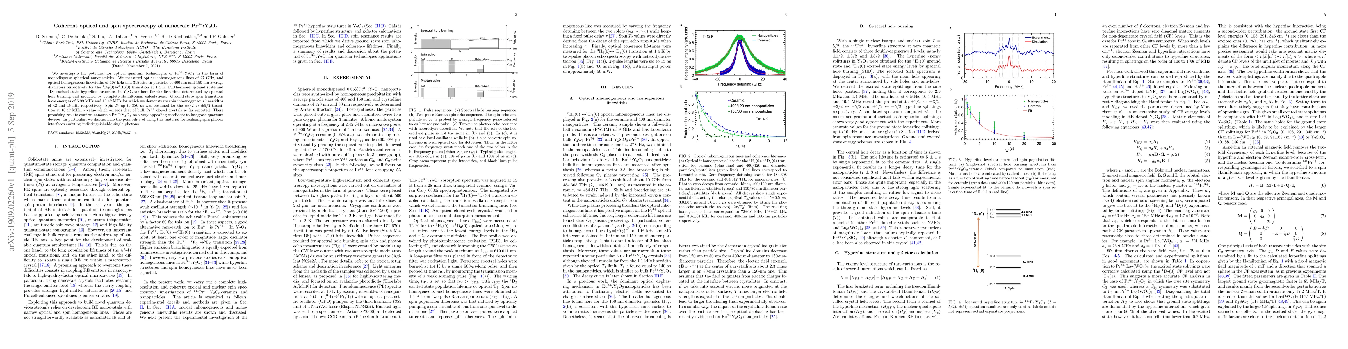 We investigate the potential for optical quantum technologies of Pr3+:Y2O3 in the form of monodisperse spherical nanoparticles. We measured optical inhomogeneous lines of 27 GHz, and optical homogeneous linewidths of 108 kHz and 315 kHz in particles of 400 nm and 150 nm average diameters respectively for the 1D2(0)--> 3H4(0) transition at 1.4 K. Furthermore, ground state and 1D2 excited state hyperfine structures in Y2O3 are here for the first time determined by spectral hole burning and modeled by complete Hamiltonian calculations. Ground-state spin transitions have energies of 5.99 MHz and 10.42 MHz for which we demonstrate spin inhomogeneous linewidths of 42 and 45 kHz respectively. Spin T2 up to 880 microseconds was obtained for the +-3/2-->+-5/2 transition at 10.42 MHz, a value which exceeds that of bulk Pr3+ doped crystals so far reported. These promising results confirm nanoscale Pr3+:Y2O3 as a very appealing candidate to integrate quantum devices. In particular, we discuss here the possibility of using this material for realizing spin photon interfaces emitting indistinguishable single photons.