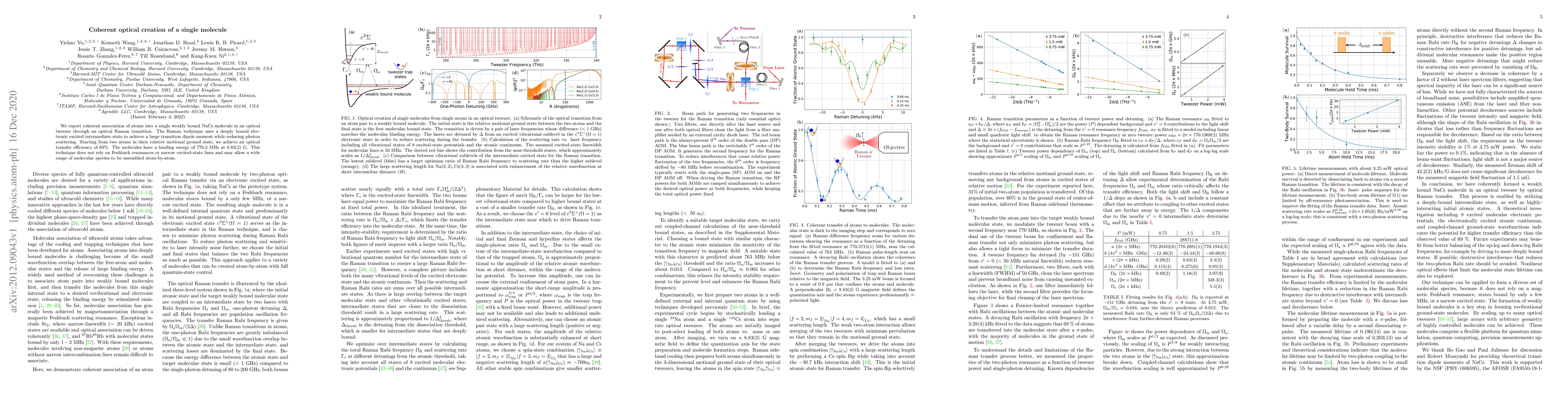 We report coherent association of atoms into a single weakly bound NaCs molecule in an optical tweezer through an optical Raman transition. The Raman technique uses a deeply bound electronic excited intermediate state to achieve a large transition dipole moment while reducing photon scattering. Starting from two atoms in their relative motional ground state, we achieve an optical transfer efficiency of 69%. The molecules have a binding energy of 770.2MHz at 8.83(2)G. This technique does not rely on Feshbach resonances or narrow excited-state lines and may allow a wide range of molecular species to be assembled atom-by-atom.
