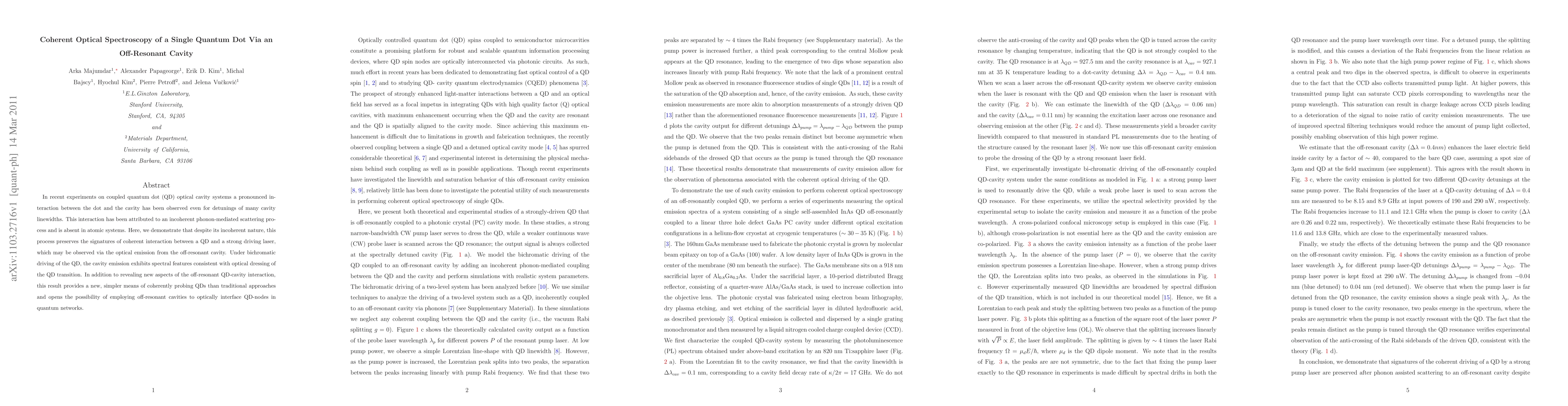In recent experiments on coupled quantum dot (QD) optical cavity systems a pronounced interaction between the dot and the cavity has been observed even for detunings of many cavity linewidths. This interaction has been attributed to an incoherent phonon-mediated scattering process and is absent in atomic systems. Here, we demonstrate that despite its incoherent nature, this process preserves the signatures of coherent interaction between a QD and a strong driving laser, which may be observed via the optical emission from the off-resonant cavity. Under bichromatic driving of the QD, the cavity emission exhibits spectral features consistent with optical dressing of the QD transition. In addition to revealing new aspects of the off-resonant QD-cavity interaction, this result provides a new, simpler means of coherently probing QDs than traditional approaches and opens the possibility of employing off-resonant cavities to optically interface QD-nodes in quantum networks.