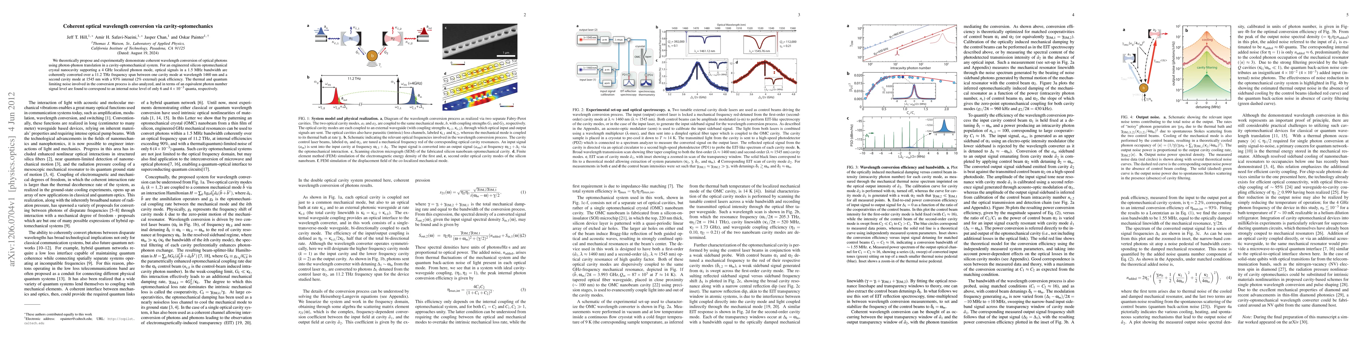 We theoretically propose and experimentally demonstrate coherent wavelength conversion of optical photons using photon-phonon translation in a cavity-optomechanical system. For an engineered silicon optomechanical crystal nanocavity supporting a 4 GHz localized phonon mode, optical signals in a 1.5 MHz bandwidth are coherently converted over a 11.2 THz frequency span between one cavity mode at wavelength 1460 nm and a second cavity mode at 1545 nm with a 93% internal (2% external) peak efficiency. The thermal and quantum limiting noise involved in the conversion process is also analyzed, and in terms of an equivalent photon number signal level are found to correspond to an internal noise level of only 6 and 4x10-3 quanta, respectively.
