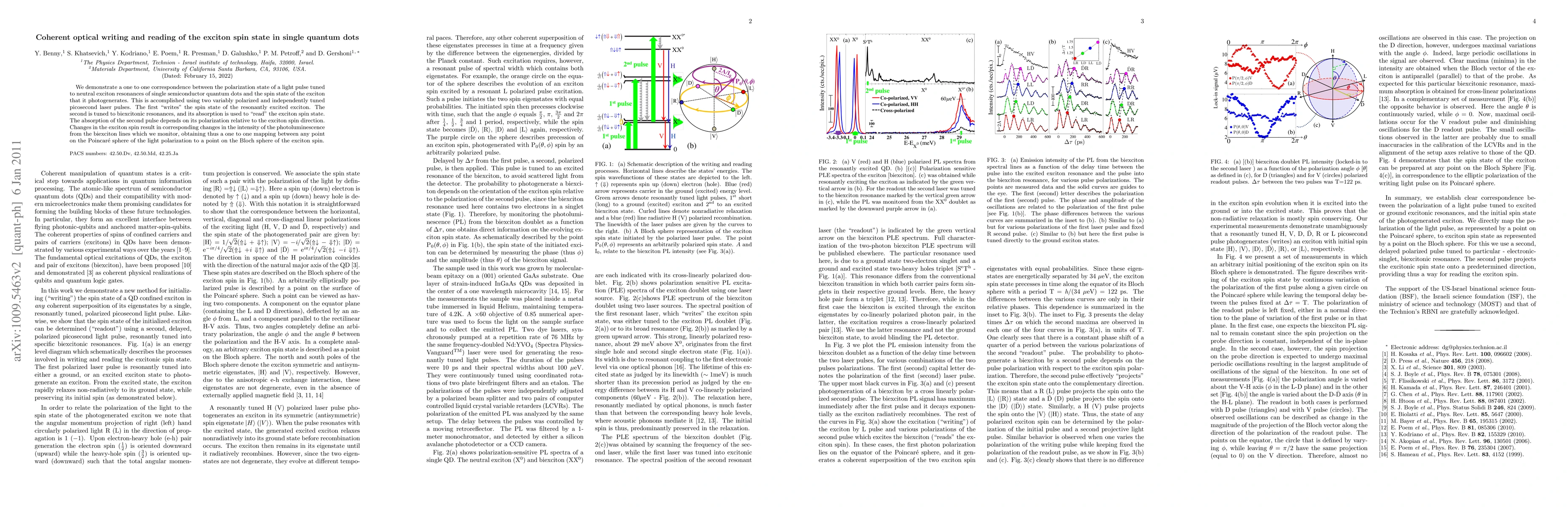 We demonstrate a one to one correspondence between the polarization state of a light pulse tuned to neutral exciton resonances of single semiconductor quantum dots and the spin state of the exciton that it photogenerates. This is accomplished using two variably polarized and independently tuned picosecond laser pulses. The first "writes" the spin state of the resonantly excited exciton. The second is tuned to biexcitonic resonances, and its absorption is used to "read" the exciton spin state. The absorption of the second pulse depends on its polarization relative to the exciton spin direction. Changes in the exciton spin result in corresponding changes in the intensity of the photoluminescence from the biexciton lines which we monitor, obtaining thus a one to one mapping between any point on the Poincare sphere of the light polarization to a point on the Bloch sphere of the exciton spin.