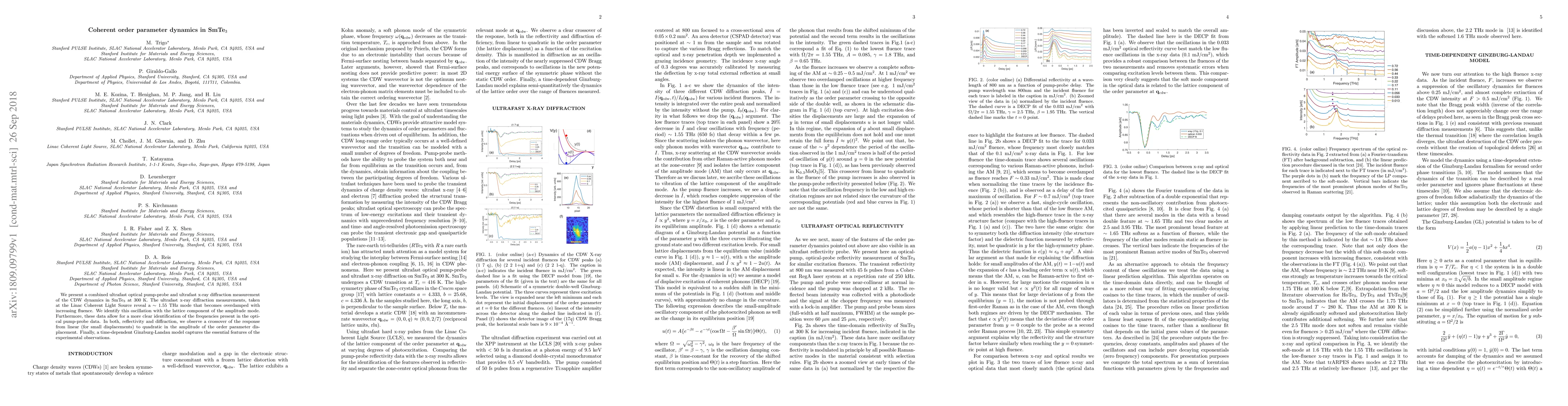 We present a combined ultrafast optical pump-probe and ultrafast x-ray diffraction measurement of the CDW dynamics in SmTe$_3$ at 300 K. The ultrafast x-ray diffraction measurements, taken at the Linac Coherent Light Source reveal a $\sim 1.55$ THz mode that becomes overdamped with increasing fluence. We identify this oscillation with the lattice component of the amplitude mode. Furthermore, these data allow for a more clear identification of the frequencies present in the optical pump-probe data. In both, reflectivity and diffraction, we observe a crossover of the response from linear (for small displacements) to quadratic in the amplitude of the order parameter displacement. Finally, a time-dependent Ginzburg-Landau model captures the essential features of the experimental observations.
