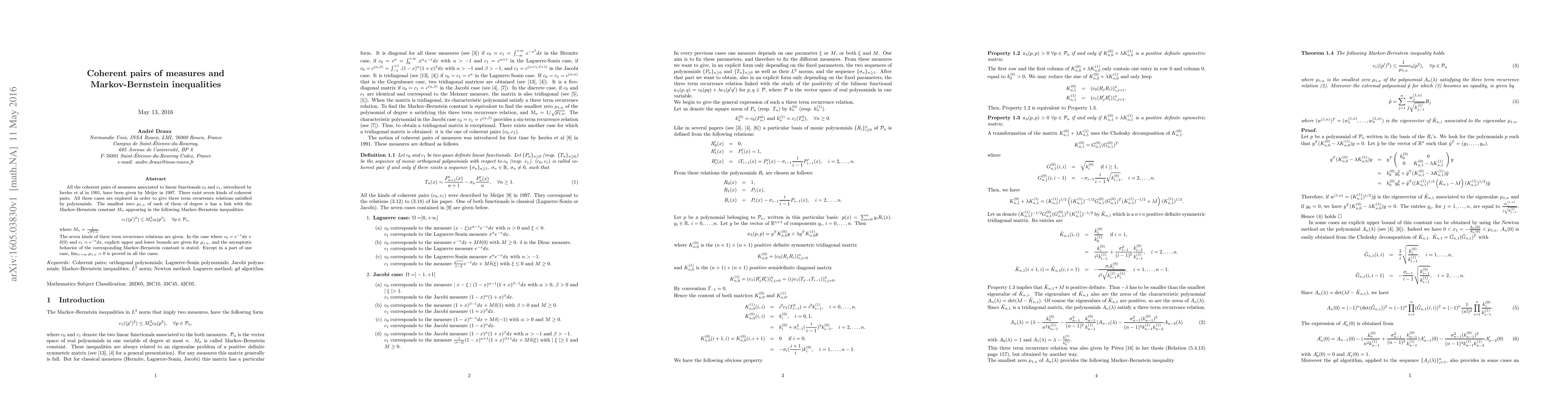 This paper explores coherent pairs of measures associated with linear functionals, deriving three-term recurrence relations for polynomials linked to these measures. It establishes connections between the smallest zero of these polynomials and the Markov-Bernstein constant, providing explicit bounds and asymptotic behavior for specific cases.