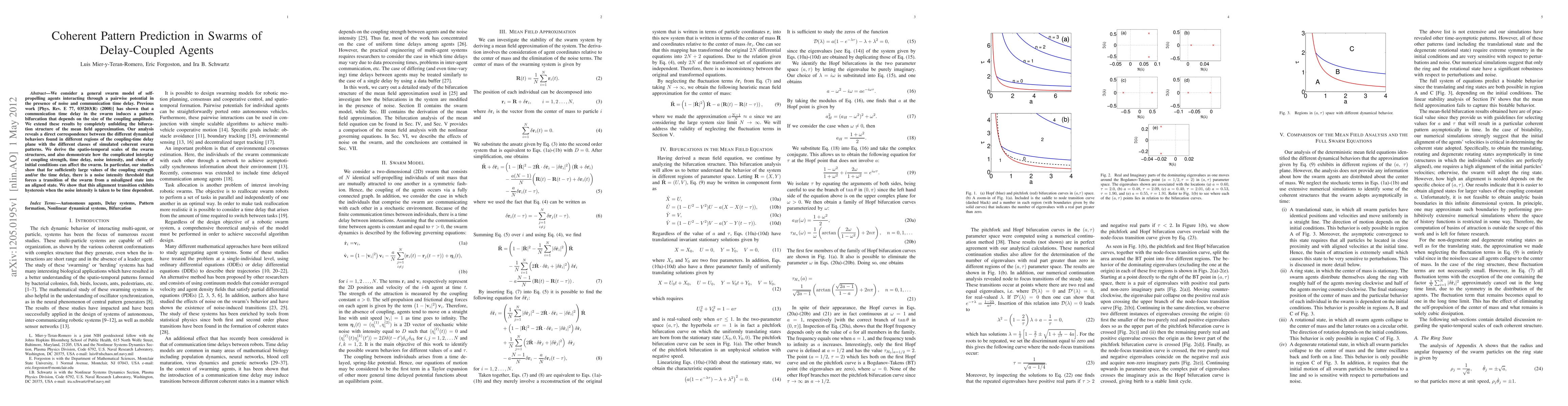We consider a general swarm model of self-propelling agents interacting through a pairwise potential in the presence of noise and communication time delay. Previous work [Phys. Rev. E 77, 035203(R) (2008)] has shown that a communication time delay in the swarm induces a pattern bifurcation that depends on the size of the coupling amplitude. We extend these results by completely unfolding the bifurcation structure of the mean field approximation. Our analysis reveals a direct correspondence between the different dynamical behaviors found in different regions of the coupling-time delay plane with the different classes of simulated coherent swarm patterns. We derive the spatio-temporal scales of the swarm structures, and also demonstrate how the complicated interplay of coupling strength, time delay, noise intensity, and choice of initial conditions can affect the swarm. In particular, our studies show that for sufficiently large values of the coupling strength and/or the time delay, there is a noise intensity threshold that forces a transition of the swarm from a misaligned state into an aligned state. We show that this alignment transition exhibits hysteresis when the noise intensity is taken to be time dependent.
