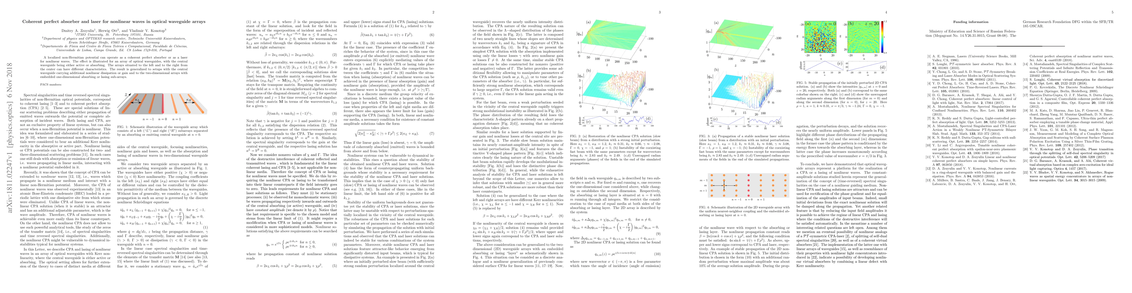 This paper explores how a localized non-Hermitian potential can function as a coherent perfect absorber or a laser for nonlinear waves in optical waveguide arrays. The study generalizes these effects to arrays with varying characteristics and includes setups with nonlinear dissipation or gain.