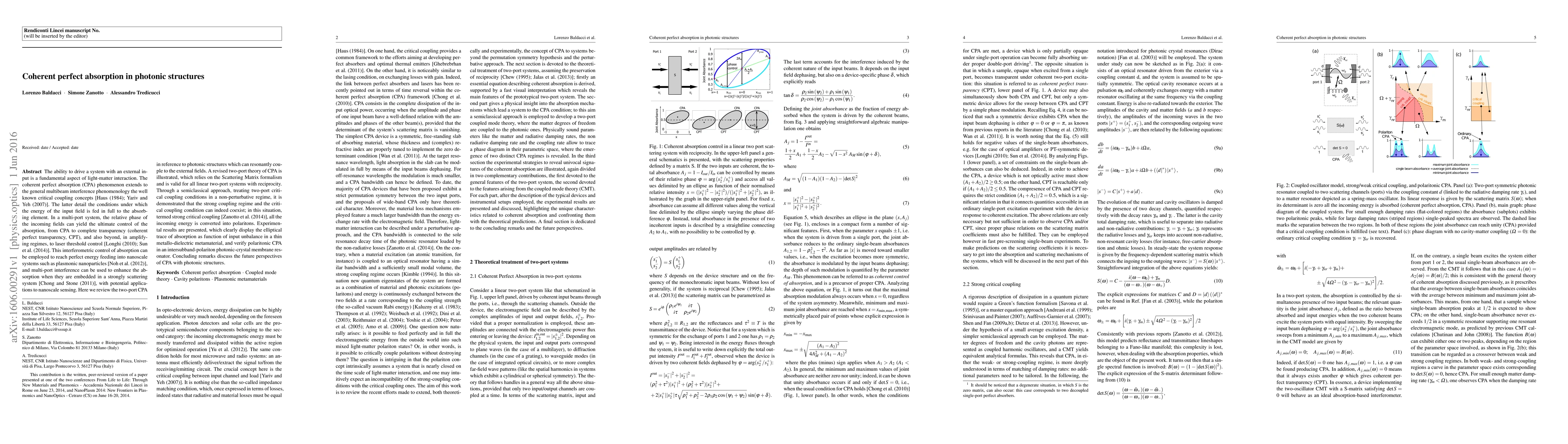 The ability to drive a system with an external input is a fundamental aspect of light-matter interaction. The coherent perfect absorption (CPA) phenomenon extends to the general multibeam interference phenomenology the well known critical coupling concepts. This interferometric control of absorption can be employed to reach full delivery of optical energy to nanoscale systems such as plasmonic nanoparticles, and multi-port interference can be used to enhance the absorption of a nanoscale device when it is embedded in a strongly scattering system, with potential applications to nanoscale sensing. Here we review the two-port CPA in reference to photonic structures which can resonantly couple to the external fields. A revised two-port theory of CPA is illustrated, which relies on the Scattering Matrix formalism and is valid for all linear two-port systems with reciprocity. Through a semiclassical approach, treating two-port critical coupling conditions in a non-perturbative regime, it is demonstrated that the strong coupling regime and the critical coupling condition can indeed coexist; in this situation, termed strong critical coupling, all the incoming energy is converted into polaritons. Experimental results are presented, which clearly display the elliptical trace of absorption as function of input unbalance in a thin metallo-dielectric metamaterial, and verify polaritonic CPA in an intersubband-polariton photonic-crystal membrane resonator. Concluding remarks discuss the future perspectives of CPA with photonic structures.
