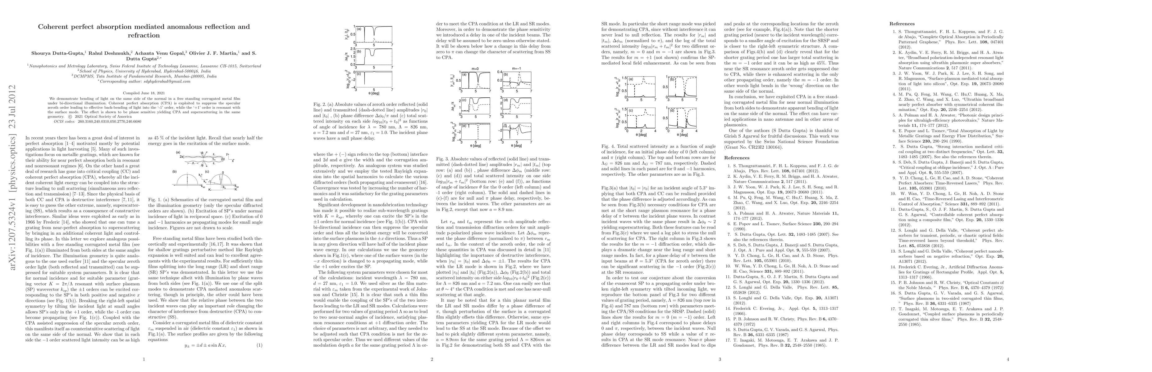 We demonstrate bending of light on the same side of the normal in a free standing corrugated metal film under bi-directional illumination. Coherent perfect absorption (CPA) is exploited to suppress the specular zeroth order leading to effective back-bending of light into the `-1' order, while the `+1' order is resonant with the surface mode. The effect is shown to be phase sensitive yielding CPA and superscattering in the same geometry.