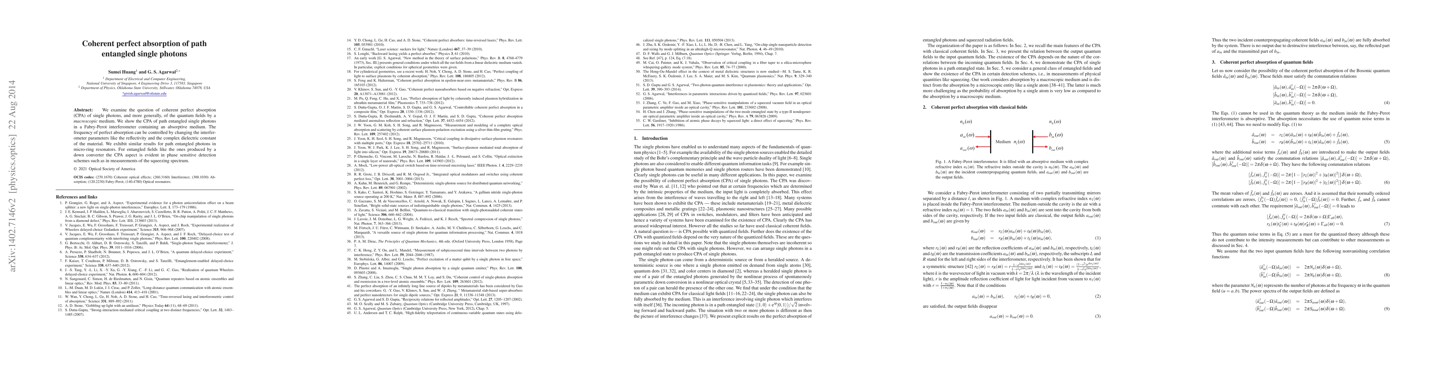We examine the question of coherent perfect absorption (CPA) of single photons, and more generally, of the quantum fields by a {\it macroscopic} medium. We show the CPA of path entangled single photons in a Fabry-Perot interferometer containing an absorptive medium. The frequency of perfect absorption can be controlled by changing the interferometer parameters like the reflectivity and the complex dielectric constant of the material. We exhibit similar results for path entangled photons in micro-ring resonators. For entangled fields like the ones produced by a down converter the CPA aspect is evident in phase sensitive detection schemes such as in measurements of the squeezing spectrum.