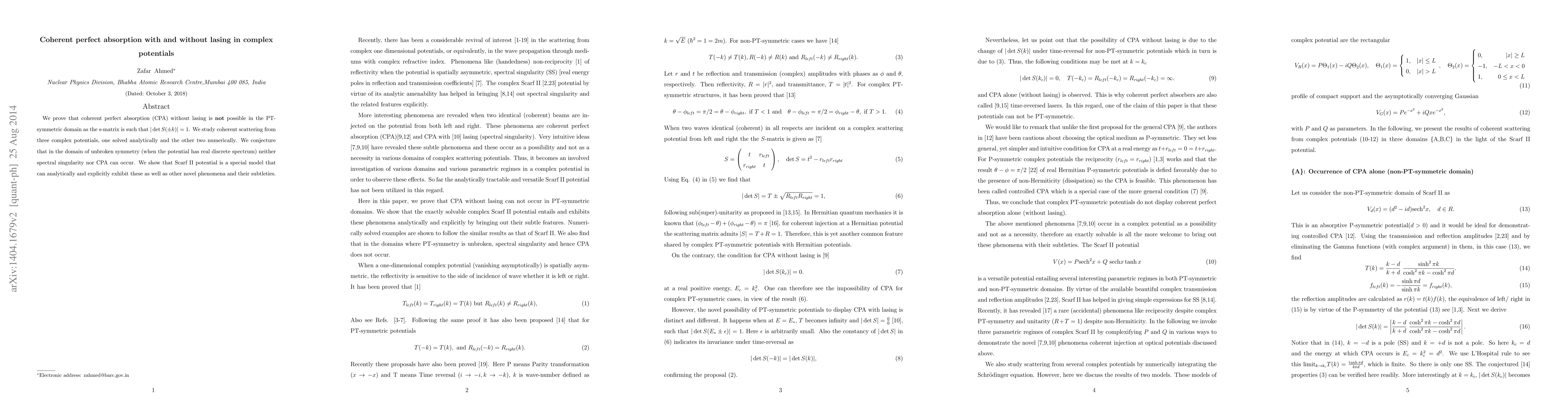 This paper demonstrates that coherent perfect absorption (CPA) without lasing is impossible in PT-symmetric systems due to the nature of the s-matrix. It examines scattering from various complex potentials, highlighting that unbroken symmetry prevents spectral singularities or CPA, except in the unique Scarf II potential.