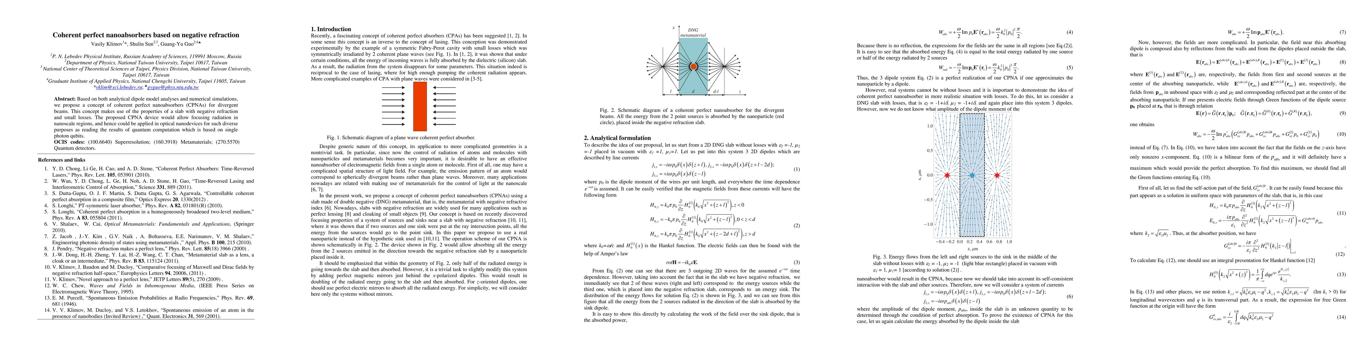 Summary: The paper proposes a concept of coherent perfect nanoabsorbers (CPNAs) utilizing negative refraction to focus radiation at the nanoscale, potentially enabling advanced optical nanodevices, including quantum computation readout systems based on single photon qubits. The approach combines analytical dipole model analyses and numerical simulations.