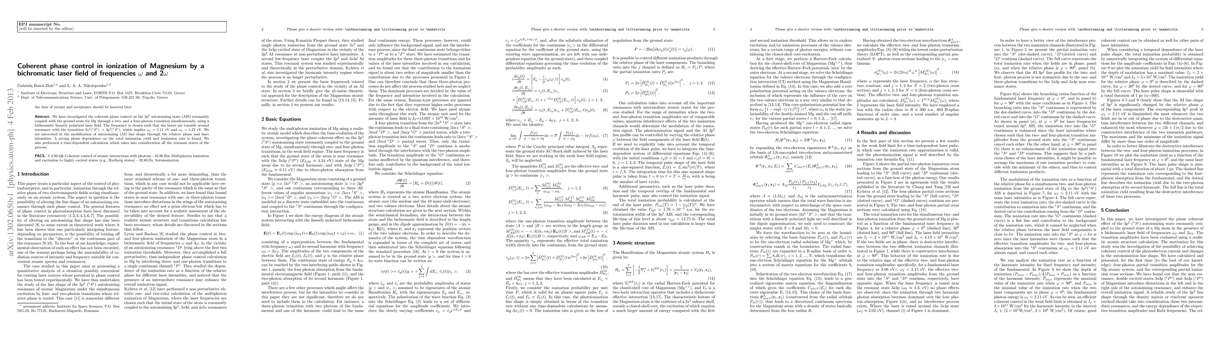 Researchers used a bichromatic laser to study phase control in ionization of Magnesium atoms, finding strong dependence on total ionization yield and rate. The results show modification of autoionizing line shape through relative phase and laser intensities.