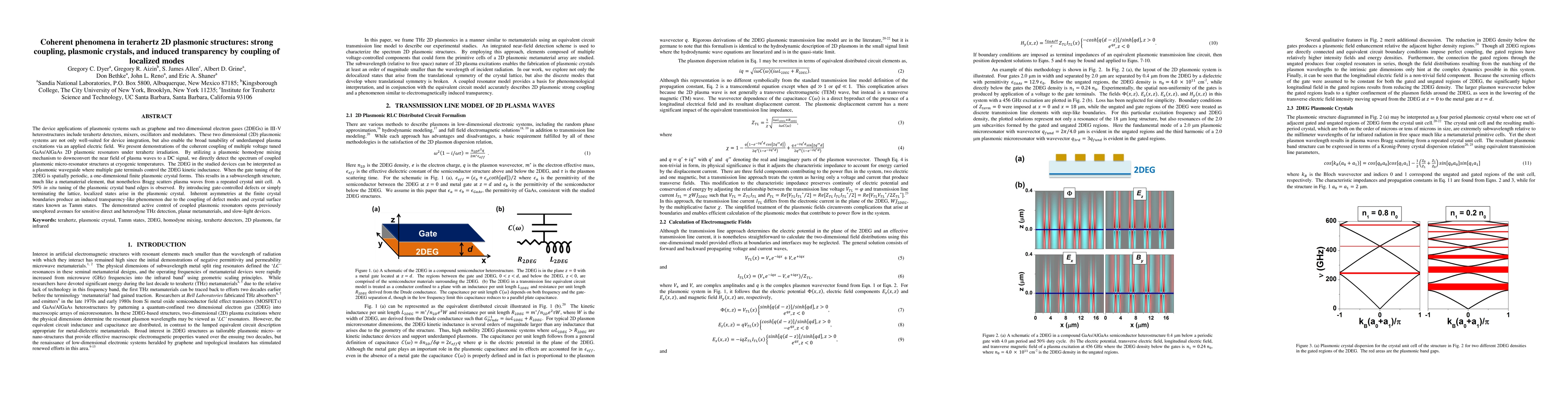 This research demonstrates the coherent coupling and manipulation of terahertz plasmonic resonators in 2D systems like graphene and 2DEGs, achieving induced transparency and tunable plasmonic crystals for advanced THz device applications. The study shows direct detection of coupled plasmonic resonances and significant in situ tuning of plasmonic crystal band edges.