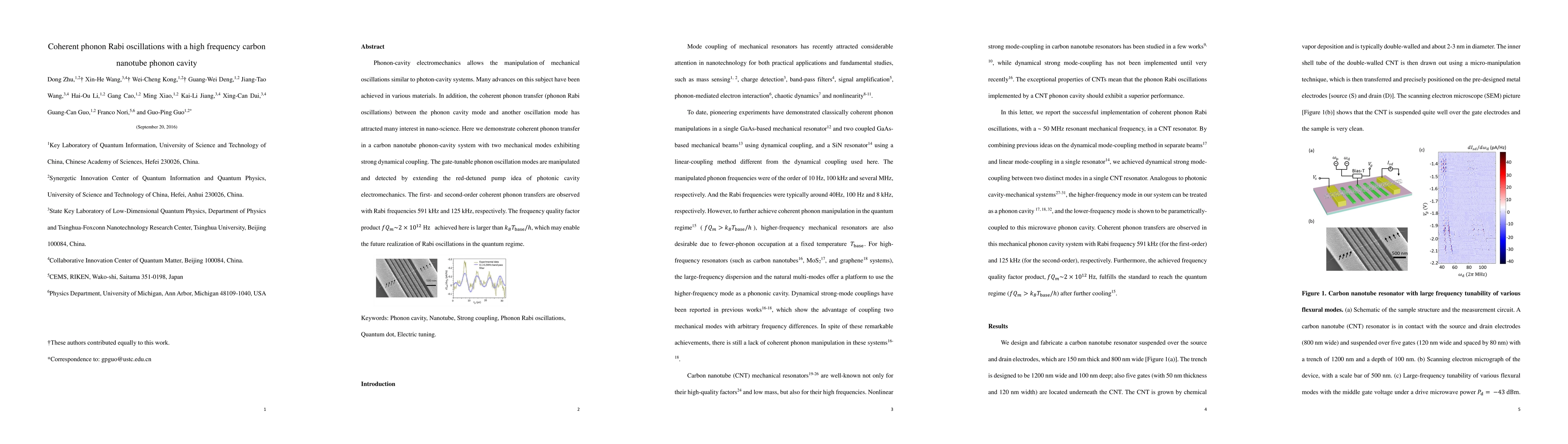 This study demonstrates coherent phonon Rabi oscillations in a carbon nanotube phonon-cavity system, observing first- and second-order phonon transfers with Rabi frequencies of 591 kHz and 125 kHz, respectively, and achieving a frequency quality factor product that surpasses thermal noise limits.