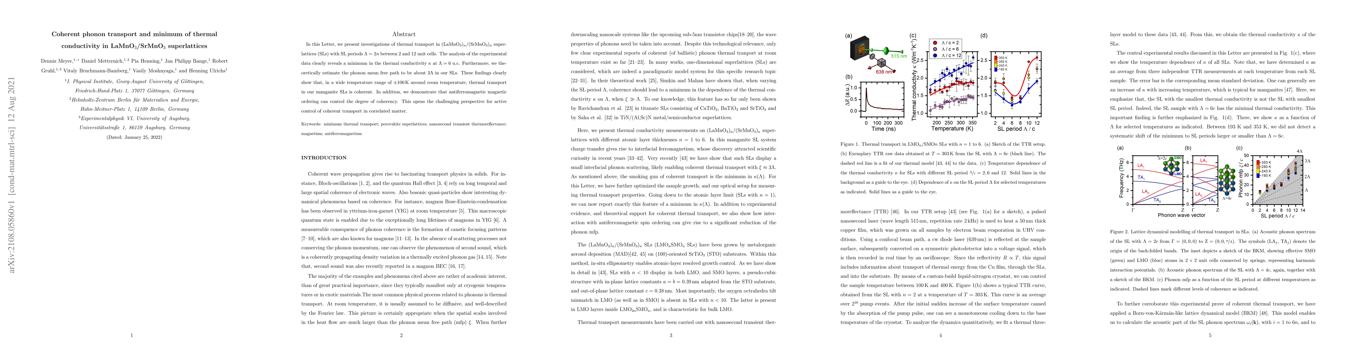 This paper investigates thermal transport in LaMnO$_3$/SrMnO$_3$ superlattices, revealing a minimum in thermal conductivity at a period of 6 unit cells. The study shows coherent phonon transport over a wide temperature range and suggests that antiferromagnetic ordering can modulate this coherence, offering potential for controlling thermal transport in correlated materials.