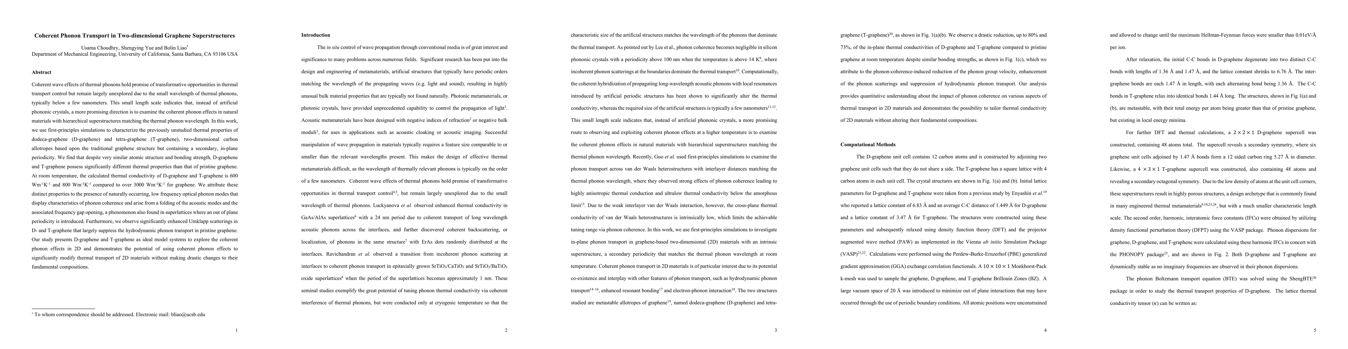 Coherent wave effects of thermal phonons hold promise of transformative opportunities in thermal transport control but remain largely unexplored due to the small wavelength of thermal phonons, typically below a few nanometers. This small length scale indicates that, instead of artificial phononic crystals, a more promising direction is to examine the coherent phonon effects in natural materials with hierarchical superstructures matching the thermal phonon wavelength. In this work, we use first-principles simulations to characterize the previously unstudied thermal properties of D-graphene and T-graphene, two-dimensional carbon allotropes based upon the traditional graphene structure but containing a secondary, in-plane periodicity. We find that despite very similar atomic structure and bonding strength, D-graphene and T-graphene possess significantly different thermal properties than that of pristine graphene. At room temperature, the calculated thermal conductivity of D-graphene and T-graphene is 600 Wm-1K-1 and 800 Wm-1K-1 compared to over 3000 Wm-1K-1 for graphene. We attribute these distinct properties to the presence of naturally occurring, low frequency optical phonon modes that display characteristics of phonon coherence and arise from a folding of the acoustic modes and the associated frequency gap opening, a phenomenon also found in superlattices where an out of plane periodicity is introduced. Furthermore, we observe significantly enhanced Umklapp scatterings in D- and T-graphene that largely suppress the hydrodynamic phonon transport in pristine graphene. Our study presents D-graphene and T-graphene as ideal model systems to explore the coherent phonon effects in 2D and demonstrates the potential of using coherent phonon effects to significantly modify thermal transport of 2D materials without making drastic changes to their fundamental compositions.