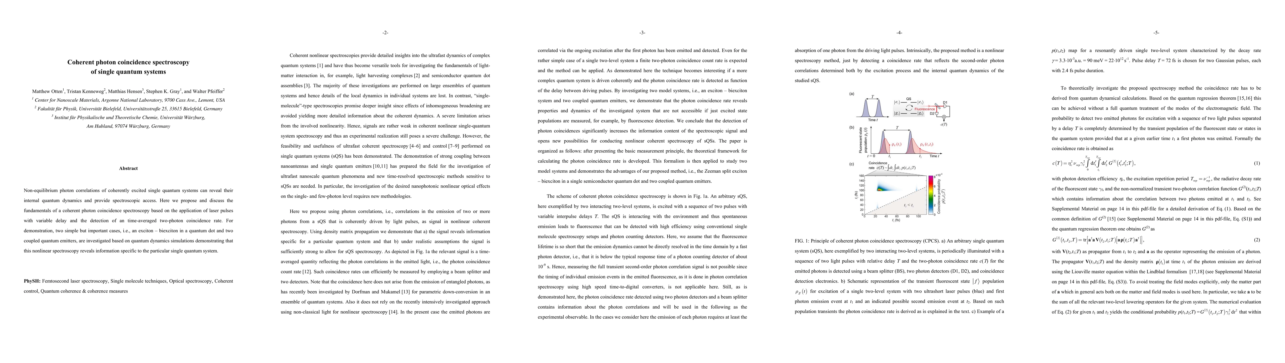 Non-equilibrium photon correlations of coherently excited single quantum systems can reveal their internal quantum dynamics and provide spectroscopic access. Here we propose and discuss the fundamentals of a coherent photon coincidence spectroscopy based on the application of laser pulses with variable delay and the detection of an time-averaged two-photon coincidence rate. For demonstration, two simple but important cases, i.e., an exciton - biexciton in a quantum dot and two coupled quantum emitters, are investigated based on quantum dynamics simulations demonstrating that this nonlinear spectroscopy reveals information specific to the particular single quantum system.