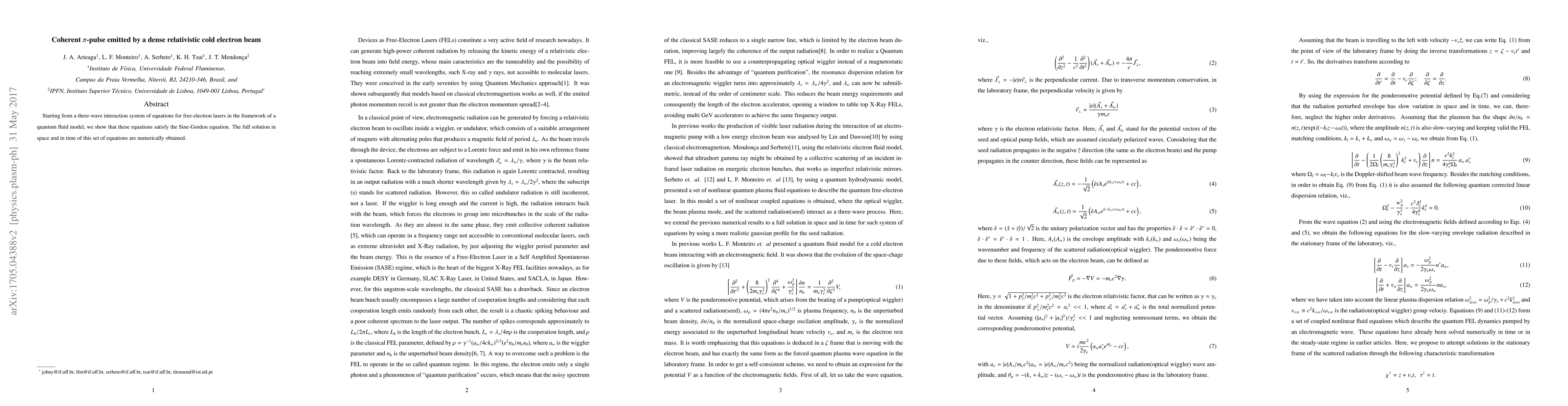 Starting from a three-wave interaction system of equations for free-electron lasers in the framework of a quantum fluid model, we show that these equations satisfy the Sine-Gordon equation. The full solution in space and in time of this set of equations are numerically obtained.