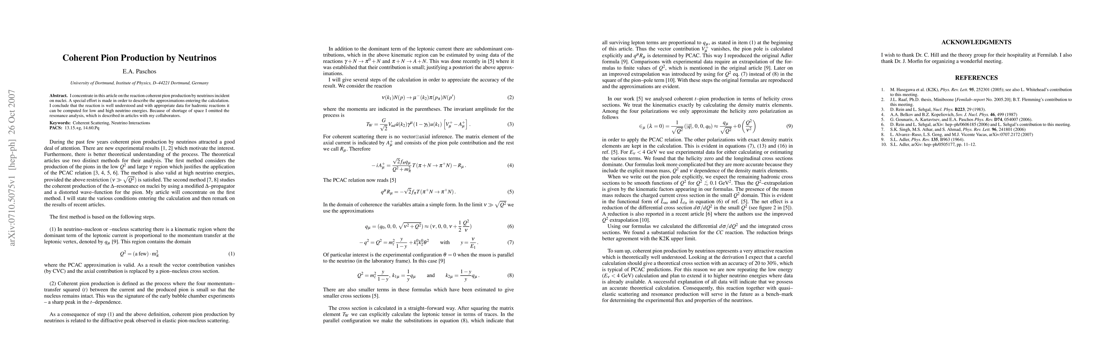 I concentrate in this article on the reaction--coherent pion production by neutrinos incident on nuclei. A special effort is made in order to describe the approximations entering the calculation. I conclude that the reaction is well understood and with appropriate data for hadronic reactions is can be computed for low and high energies. Because of shortage of space I omitted the resonance analysis, which is described in articles with my collaborators.