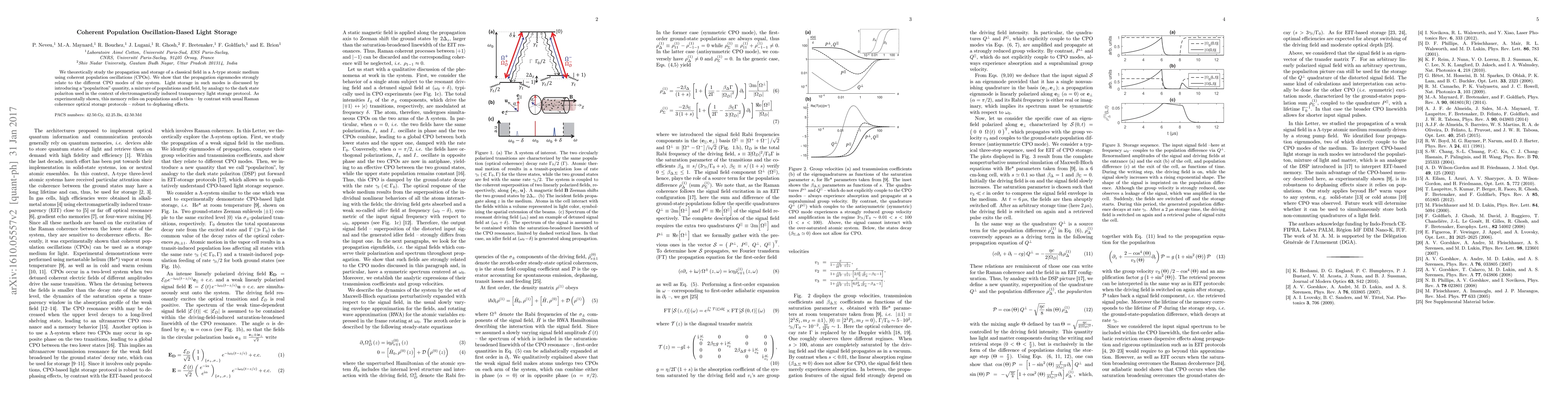 We theoretically study the propagation and storage of a classical field in a $\Lambda$-type atomic medium using coherent population oscillations (CPOs). We show that the propagation eigenmodes strongly relate to the different CPO modes of the system. Light storage in such modes is discussed by introducing a "populariton" quantity, a mixture of populations and field, by analogy to the dark state polariton used in the context of electromagnetically induced transparency light storage protocol. As experimentally shown, this memory relies on populations and is then - by contrast with usual Raman coherence optical storage protocols - robust to dephasing effects.