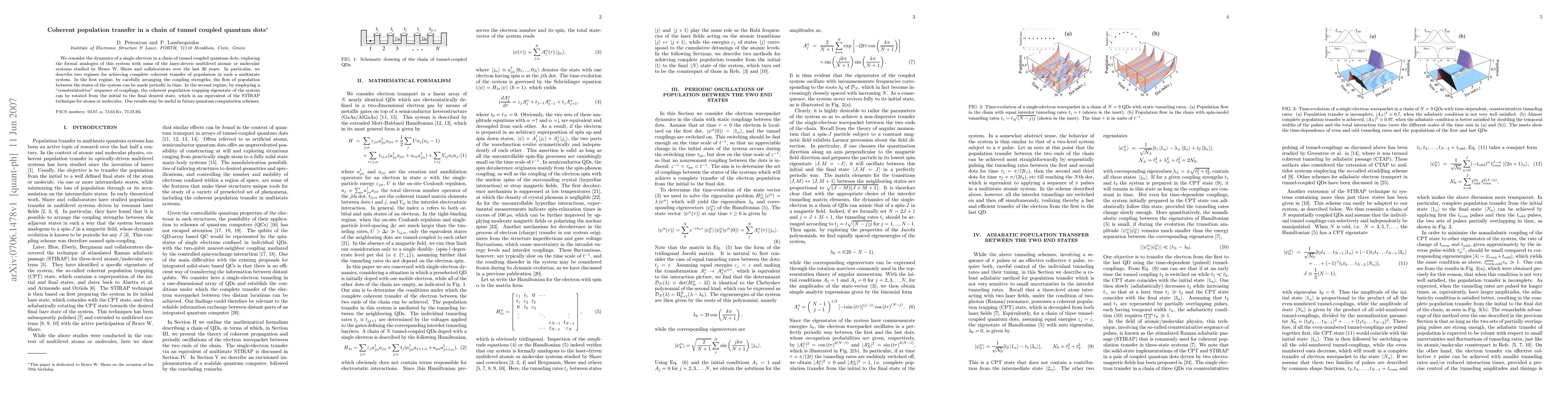We consider the dynamics of a single electron in a chain of tunnel coupled quantum dots, exploring the formal analogies of this system with some of the laser-driven multilevel atomic or molecular systems studied by Bruce W. Shore and collaborators over the last 30 years. In particular, we describe two regimes for achieving complete coherent transfer of population in such a multistate system. In the first regime, by carefully arranging the coupling strengths, the flow of population between the states of the system can be made periodic in time. In the second regime, by employing a "counterintuitive" sequence of couplings, the coherent population trapping eigenstate of the system can be rotated from the initial to the final desired state, which is an equivalent of the STIRAP technique for atoms or molecules. Our results may be useful in future quantum computation schemes.