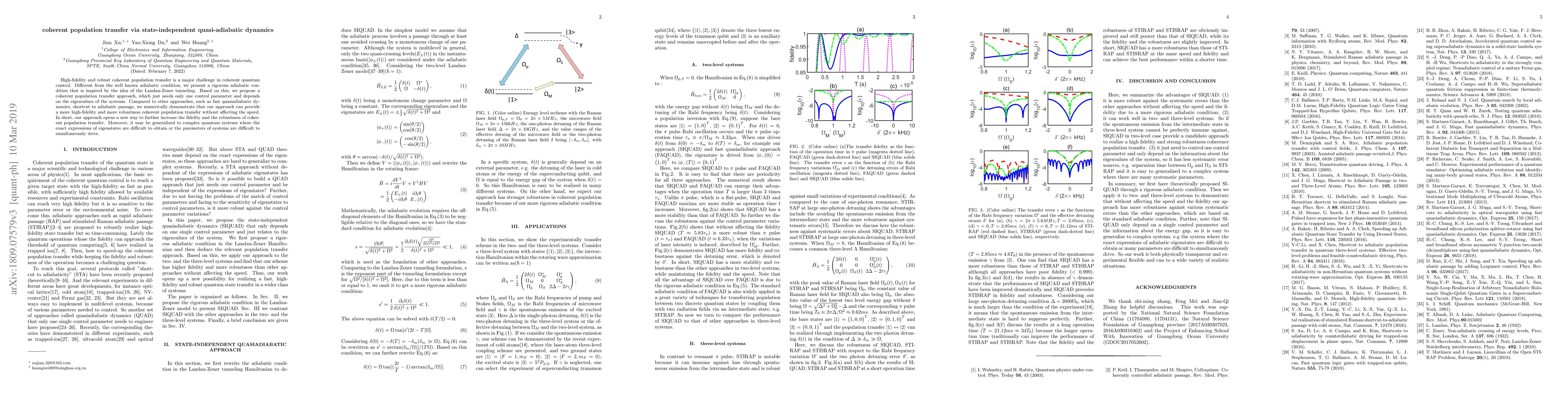 This paper proposes a novel method for coherent population transfer in quantum systems that utilizes a state-independent quasi-adiabatic dynamics inspired by Landau-Zener tunneling. The approach requires only one control parameter and demonstrates higher fidelity and robustness compared to existing methods.