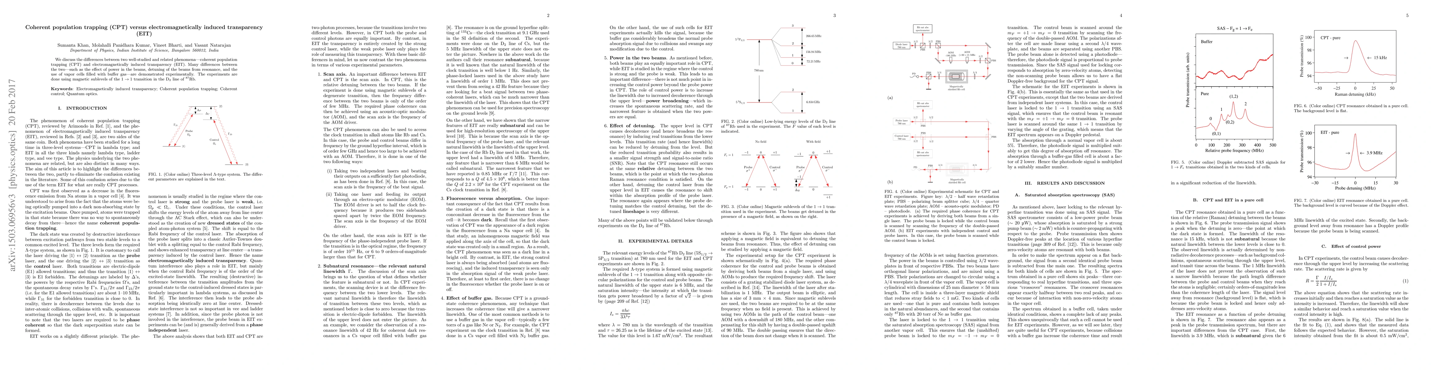 This paper compares coherent population trapping (CPT) and electromagnetically induced transparency (EIT), highlighting their experimental differences, including beam power effects, detuning, and the role of buffer gas in vapor cells. Experiments utilize the $1 \rightarrow 1$ transition in the D$_2$ line of $^{87}$Rb.