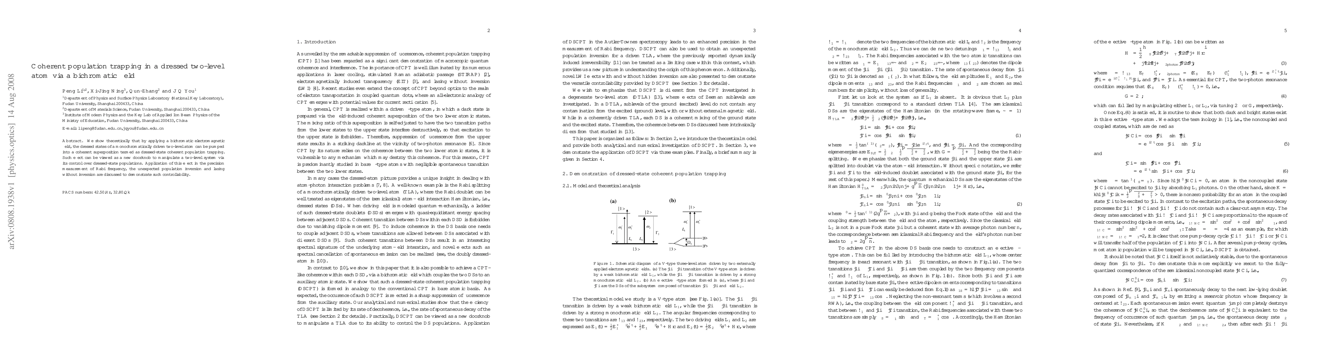 This paper demonstrates theoretically that a bichromatic field can induce coherent population trapping in dressed states of a driven two-level atom, enabling precise control over dressed-state populations and enabling applications like precision measurement of Rabi frequency and lasing without population inversion.