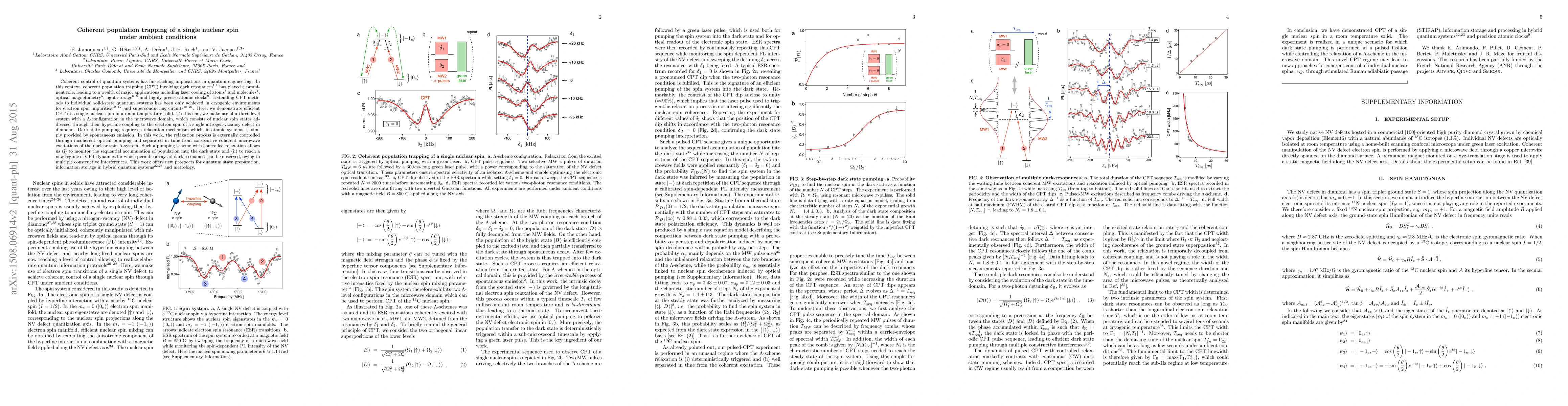 This paper demonstrates efficient coherent population trapping (CPT) of a single nuclear spin in diamond at room temperature, using a three-level $\Lambda$-configuration system involving a nitrogen-vacancy defect. The controlled relaxation via incoherent optical pumping enables monitoring of population accumulation and reveals periodic arrays of dark resonances, offering potential for quantum state preparation and hybrid quantum systems.