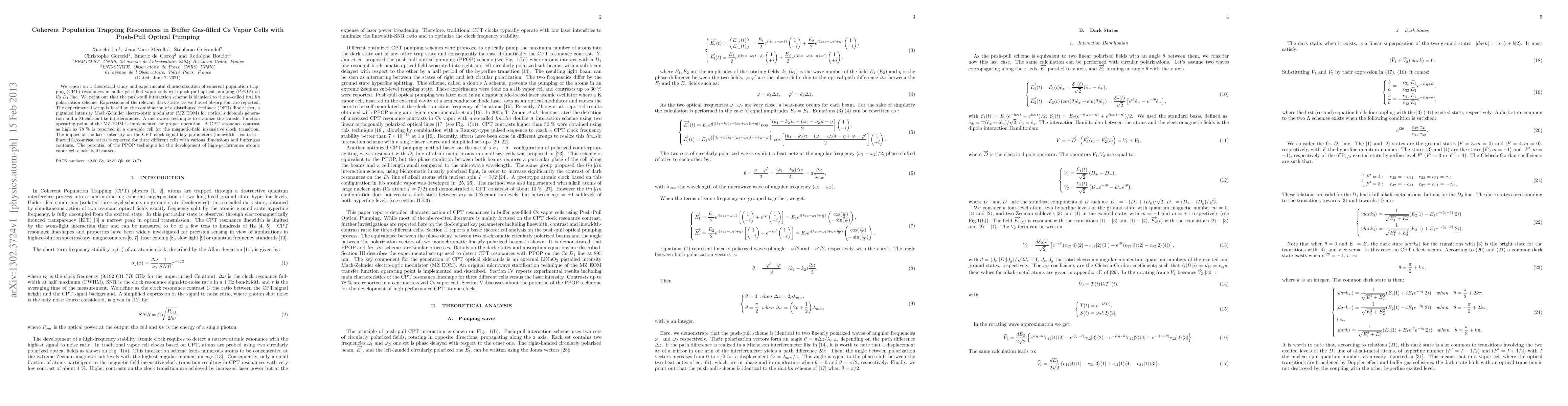 This study investigates coherent population trapping (CPT) resonances in buffer gas-filled Cs vapor cells using push-pull optical pumping, achieving a high resonance contrast of 78%. The paper discusses the impact of laser intensity on CPT clock signal parameters and explores the technique's potential for high-performance atomic clocks.