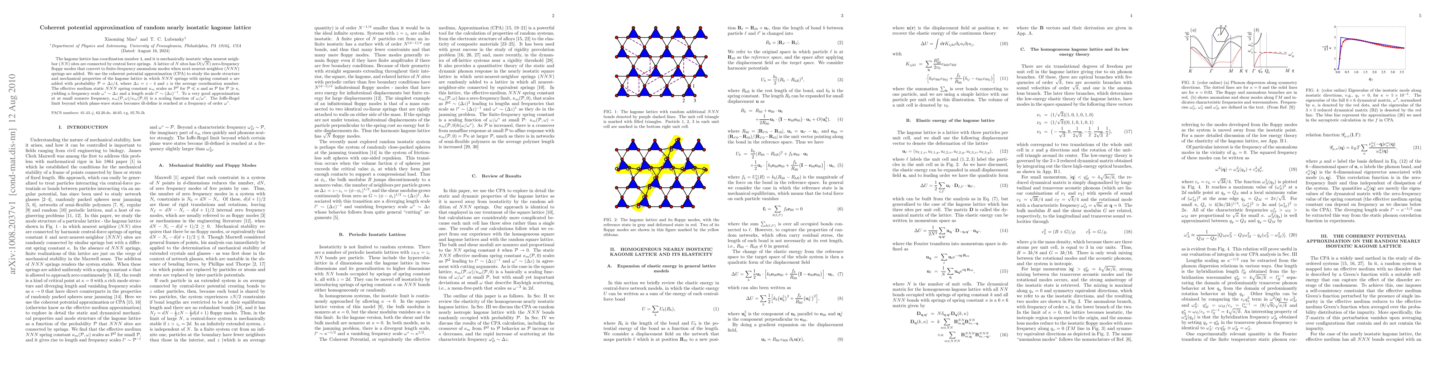 The kagome lattice has coordination number $4$, and it is mechanically isostatic when nearest neighbor ($NN$) sites are connected by central force springs. A lattice of $N$ sites has $O(\sqrt{N})$ zero-frequency floppy modes that convert to finite-frequency anomalous modes when next-nearest-neighbor ($NNN$) springs are added. We use the coherent potential approximation (CPA) to study the mode structure and mechanical properties of the kagome lattice in which $NNN$ springs with spring constant $\kappa$ are added with probability $\Prob= \Delta z/4$, where $\Delta z= z-4$ and $z$ is the average coordination number. The effective medium static $NNN$ spring constant $\kappa_m$ scales as $\Prob^2$ for $\Prob \ll \kappa$ and as $\Prob$ for $\Prob \gg \kappa$, yielding a frequency scale $\omega^* \sim \Delta z$ and a length scale $l^*\sim (\Delta z)^{-1}$. To a very good approximation at at small nonzero frequency, $\kappa_m(\Prob,\omega)/\kappa_m(\Prob,0)$ is a scaling function of $\omega/\omega^*$. The Ioffe-Regel limit beyond which plane-wave states becomes ill-define is reached at a frequency of order $\omega^*$.