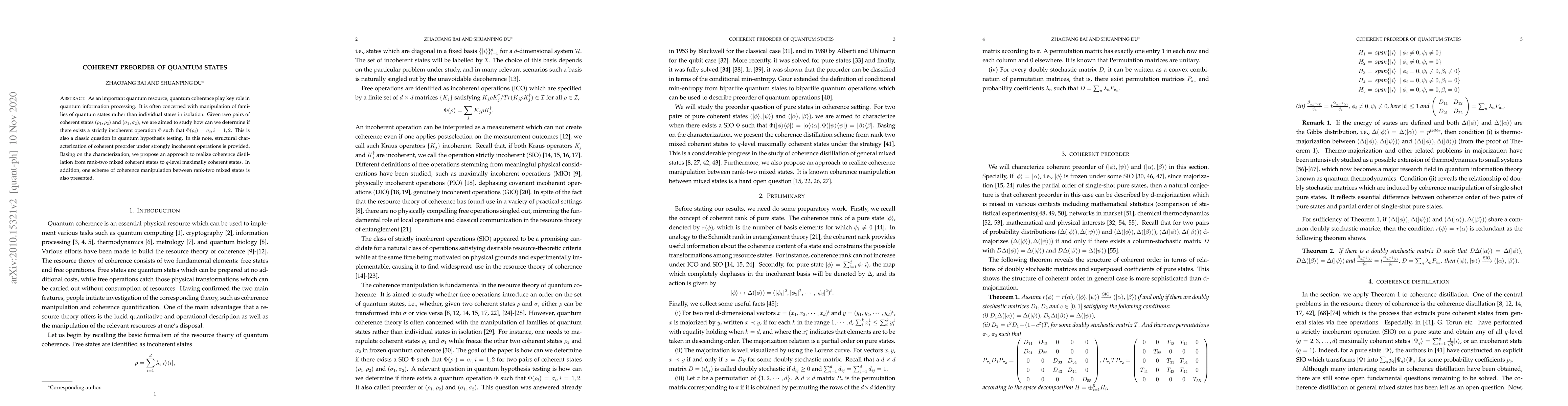 As an important quantum resource, quantum coherence play key role in quantum information processing. It is often concerned with manipulation of families of quantum states rather than individual states in isolation. Given two pairs of coherent states $(\rho_1,\rho_2)$ and $(\sigma_1,\sigma_2)$, we are aimed to study how can we determine if there exists a strictly incoherent operation $\Phi$ such that $\Phi(\rho_i) =\sigma_i,i = 1,2$. This is also a classic question in quantum hypothesis testing. In this note, structural characterization of coherent preorder under strongly incoherent operations is provided. Basing on the characterization, we propose an approach to realize coherence distillation from rank-two mixed coherent states to $q$-level maximally coherent states. In addition, one scheme of coherence manipulation between rank-two mixed states is also presented.
